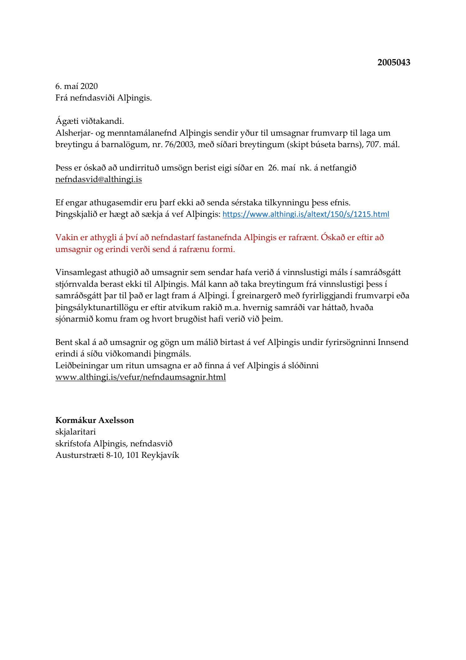 Beiðni frá alsherjar- og menntamálanefnd Alþingis, dags. 6. maí, þar sem óskað er eftir umsögn um frumvarp til laga um breytingu á barnalögum, nr. 76/2003, með síðari breytingum (skipt búseta barns), 707. mál.