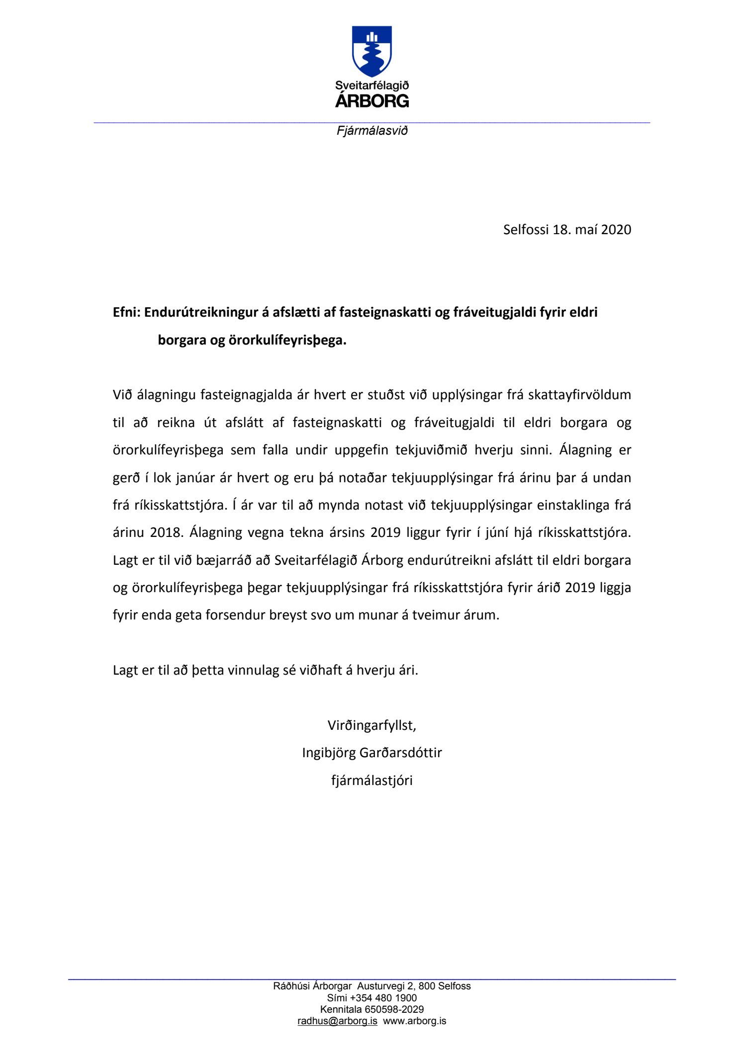 Tillaga frá fjármálastjóra, dags. 18. maí, þar sem lagt er til að gerður verði endurútreikningur á afslætti af fasteignaskatti og fráveitugjaldi fyrir eldri borgara og örorkulífeyrisþega þegar tekjuupplýsingar frá ríkisskattstjóra fyrir árið 2019 liggja fyrir.