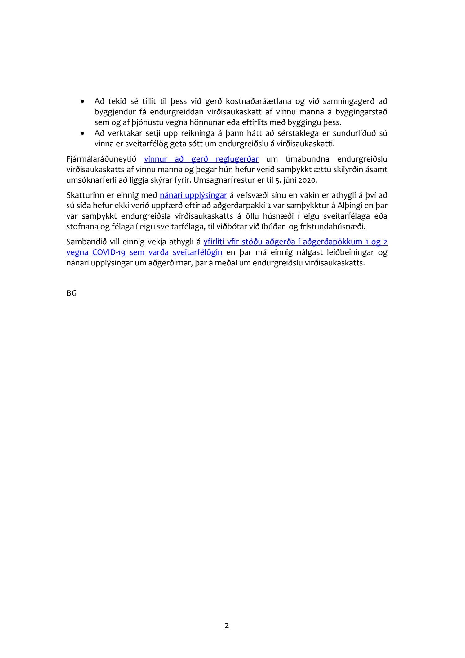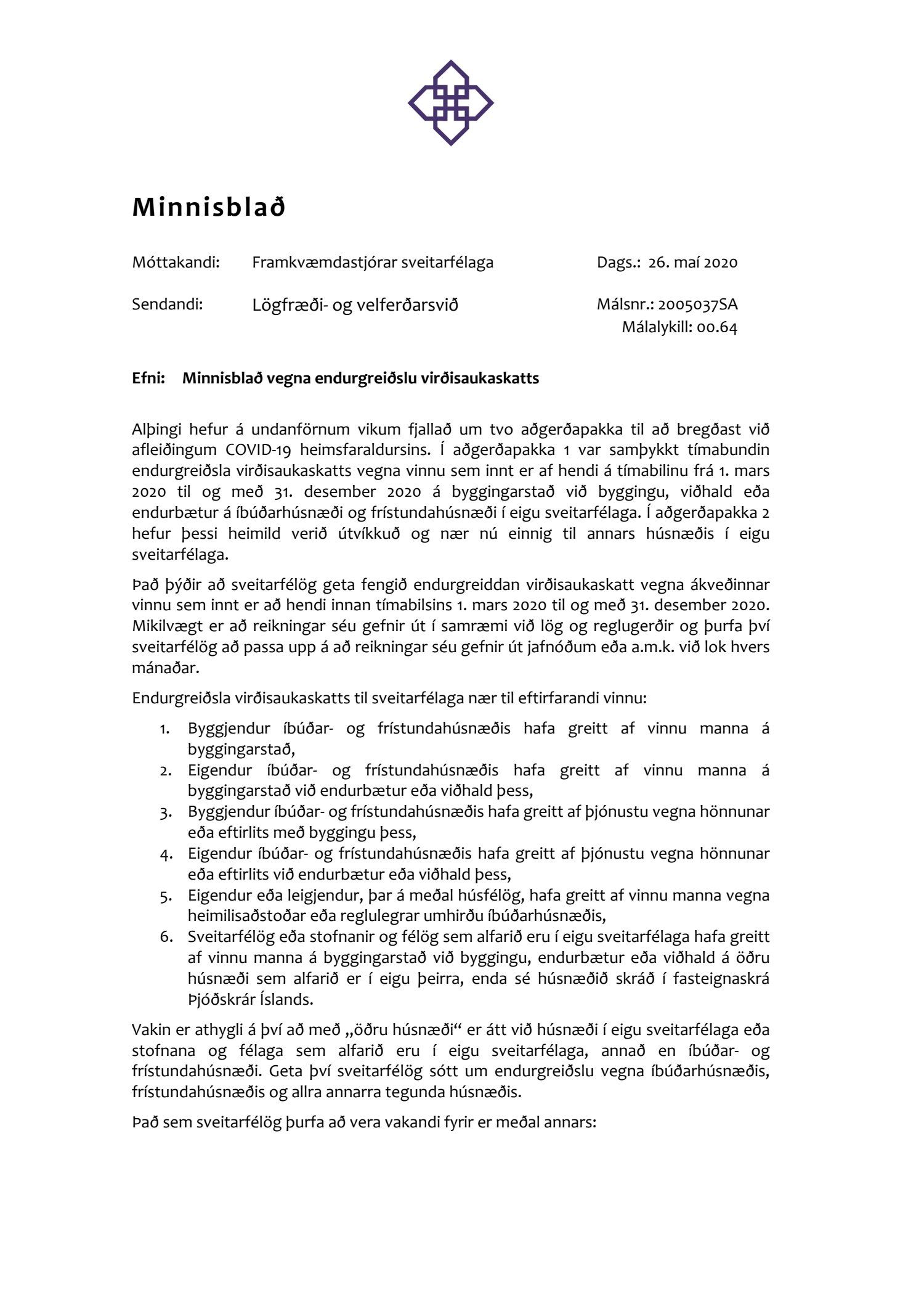 Minnisblað frá Sambandi íslenskra sveitarfélaga, dags. 26. maí, vegna endurgreiðslu á virðisaukaskatti vegna Covid-19.