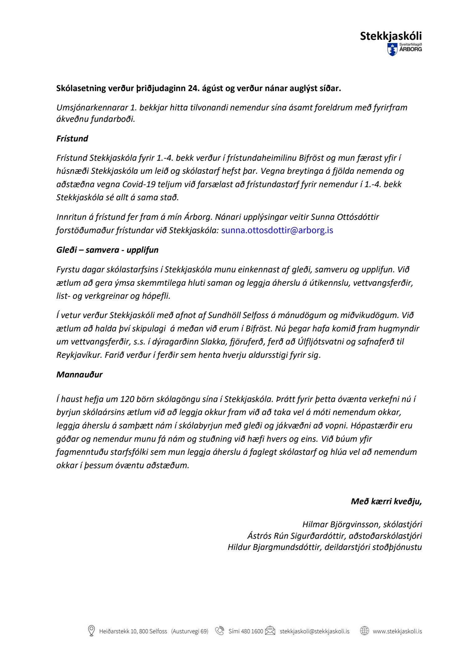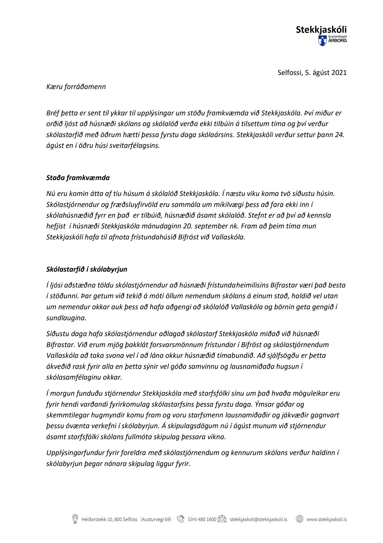 Gengið hefur verið frá því í góðu samstarfi við Vallaskóla og frístundaþjónustu að Stekkjaskóli hefur afnot af frístundahúsinu Bifröst við Vallaskóla frá skólasetningu og til 20. september. Stekkjaskóli mun fá Bifröst til afnota frá 16. ágúst.