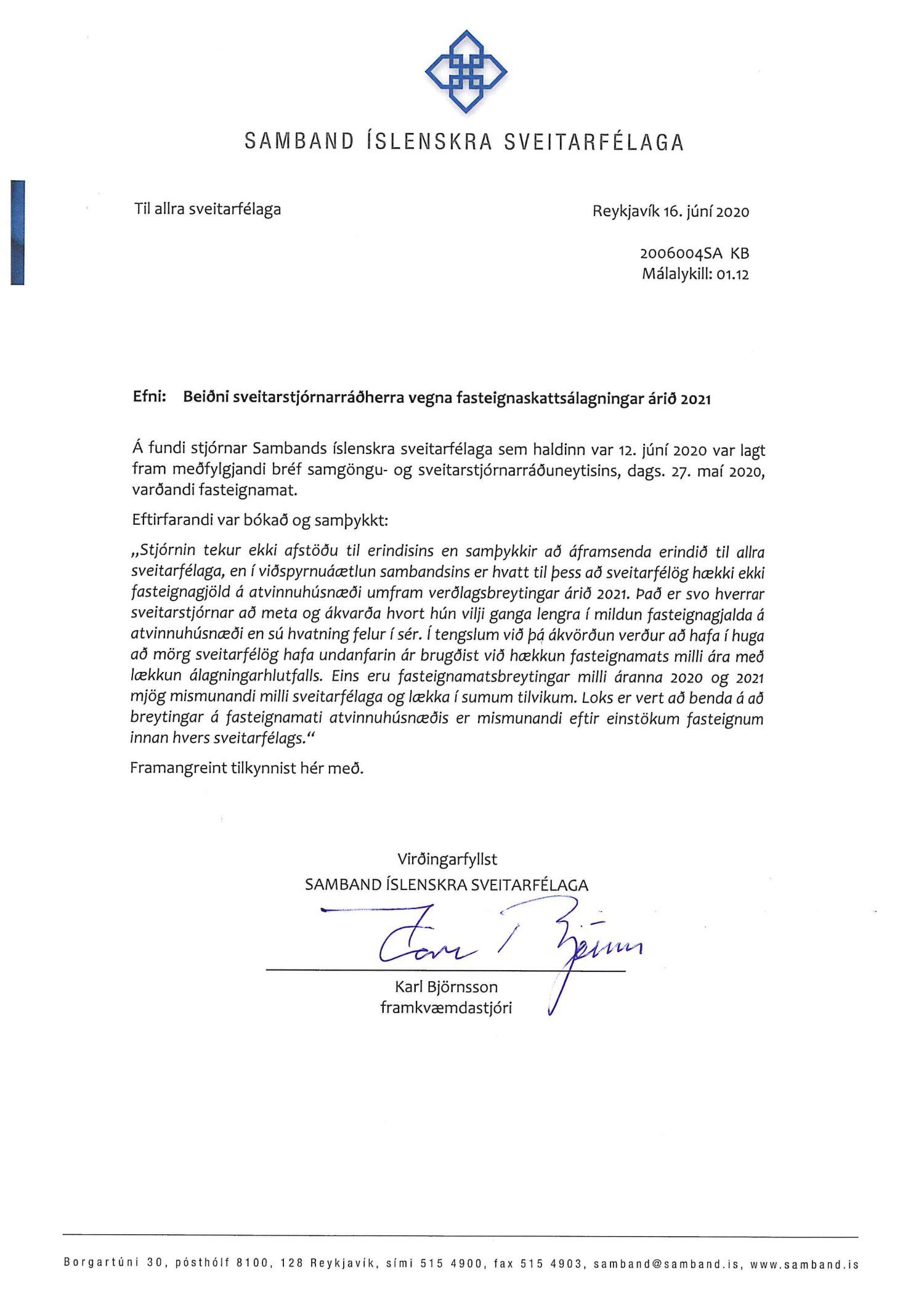 Bókun frá Sambandi íslenskra sveitarfélaga, dags. 16. júní, - beiðni sveitarstjórnarráðherra vegna fasteignaskattsálagningar árið 2021.