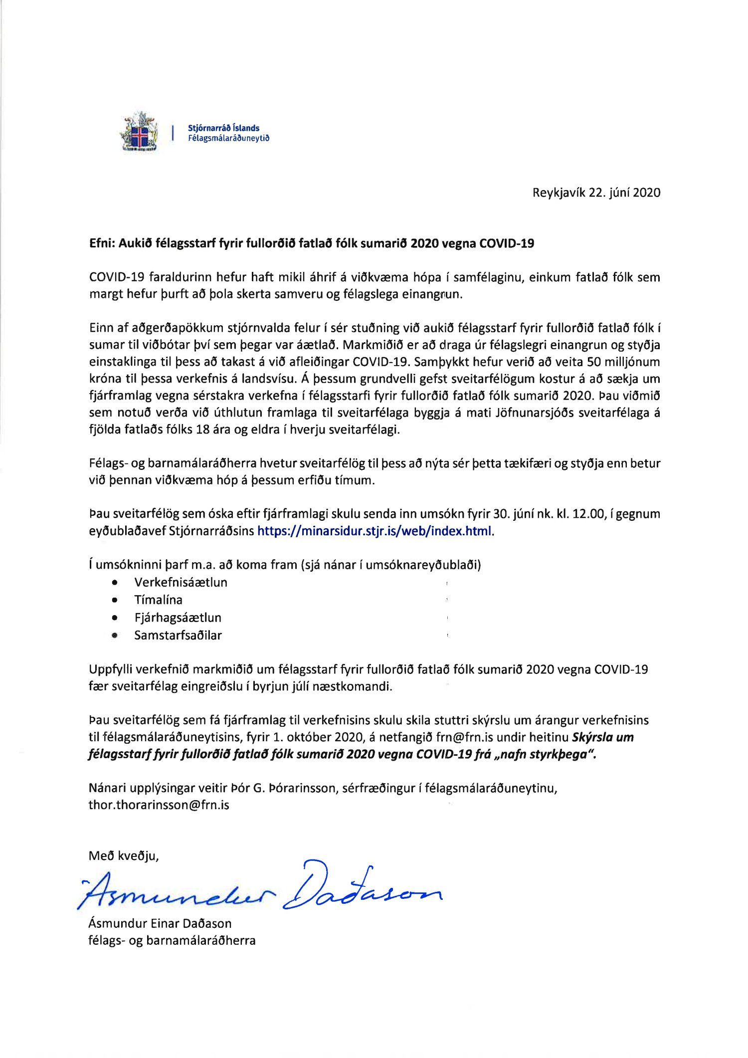 Erindi frá félagsmálaráðuneytinu, dags. 22. júní, þar sem sveitarfélög er hvött til að auka félagsstarf fyrir fullorðið fatlað fólk sumarið 2020 vegna Covid-19. Hægt er að senda inn umsókn fyrir 30. júní nk. og óska eftir fjárframlagi.