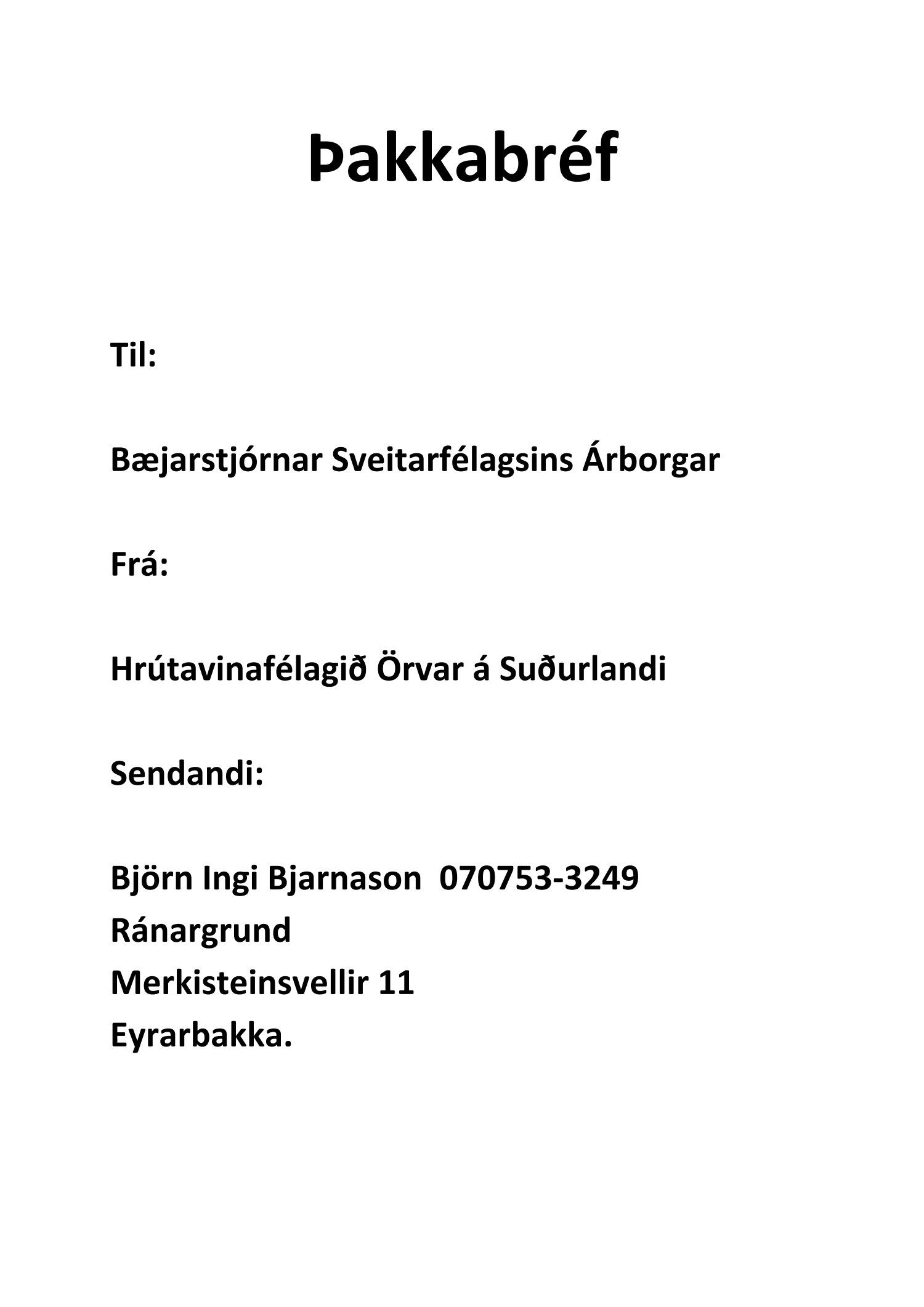 Þakkarbréf frá Hrútavinafélaginu Örvari á Suðurlandi, vegna lagningar gangbrautar við Litla-Hraun.