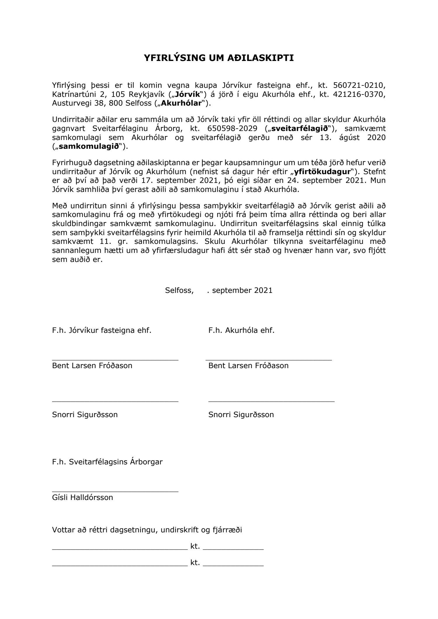 Yfirlýsing um aðildaskipti um að Jórvík tækju yfir öll réttindi og allar skyldur Akurhóla gagnvart Sveitarfélaginu Árborg, samkvæmt samkomulagi sem Akurhólar og sveitarfélagið gerðu með sér 13. ágúst 2020.