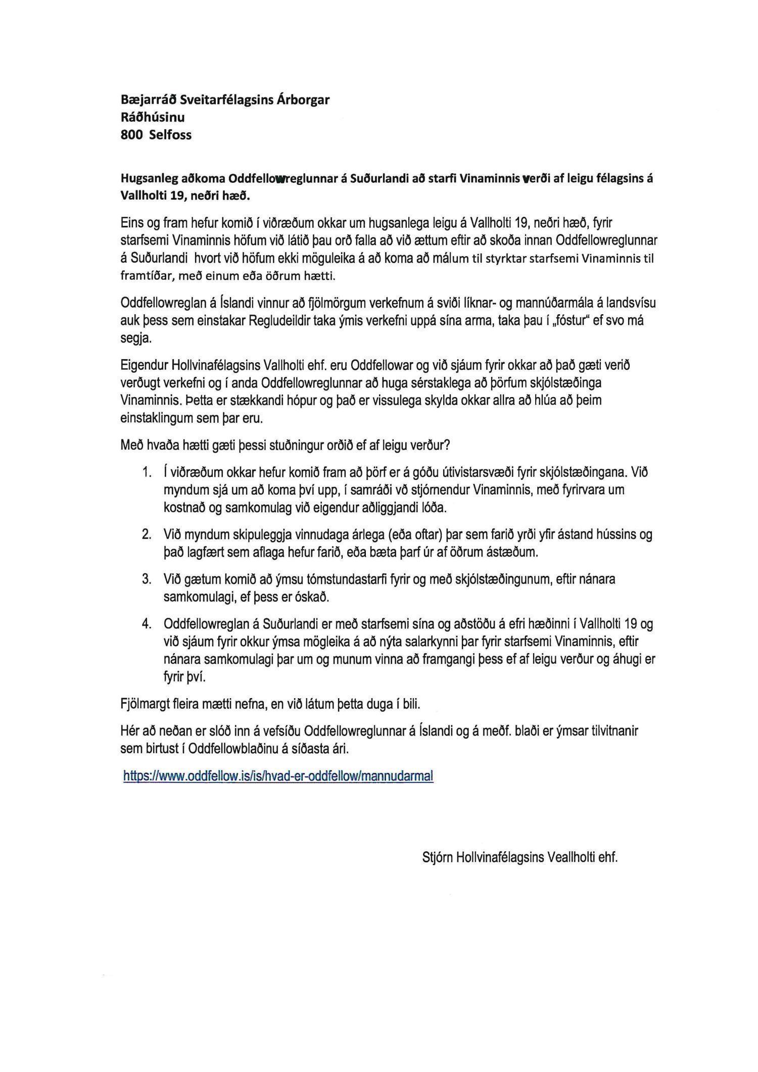 Félagar í Oddfellow hafa lýst vilja sínum til að styðja við starfsemi Vinaminnis með félagslegri aðkomu. Í fylgiskjali er þessum hugmyndum lýst nánar. Bæjarráð vísaði endanlegum samningi til samþykktar í bæjarstjórn.