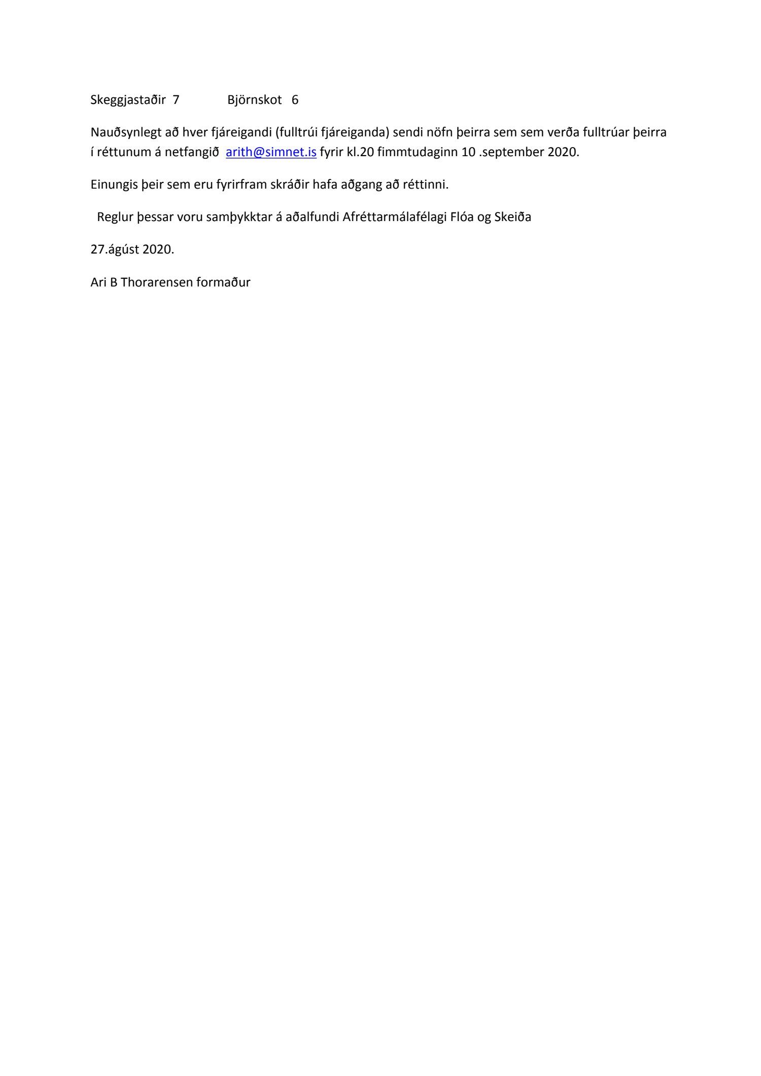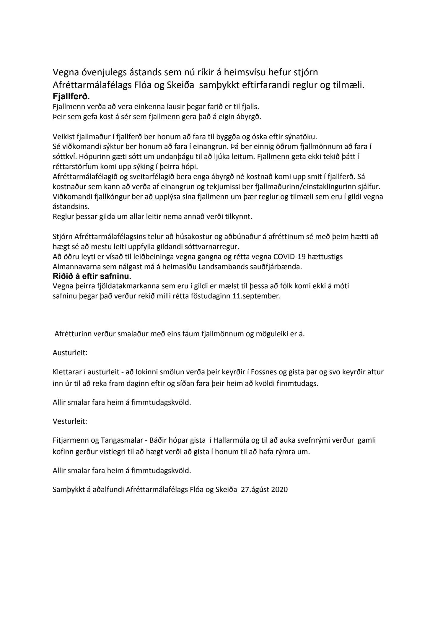 Erindi frá Afréttamálafélagi Flóa og Skeiða, dags. 27. ágúst um reglur um réttir og fjallferð árið 2020.