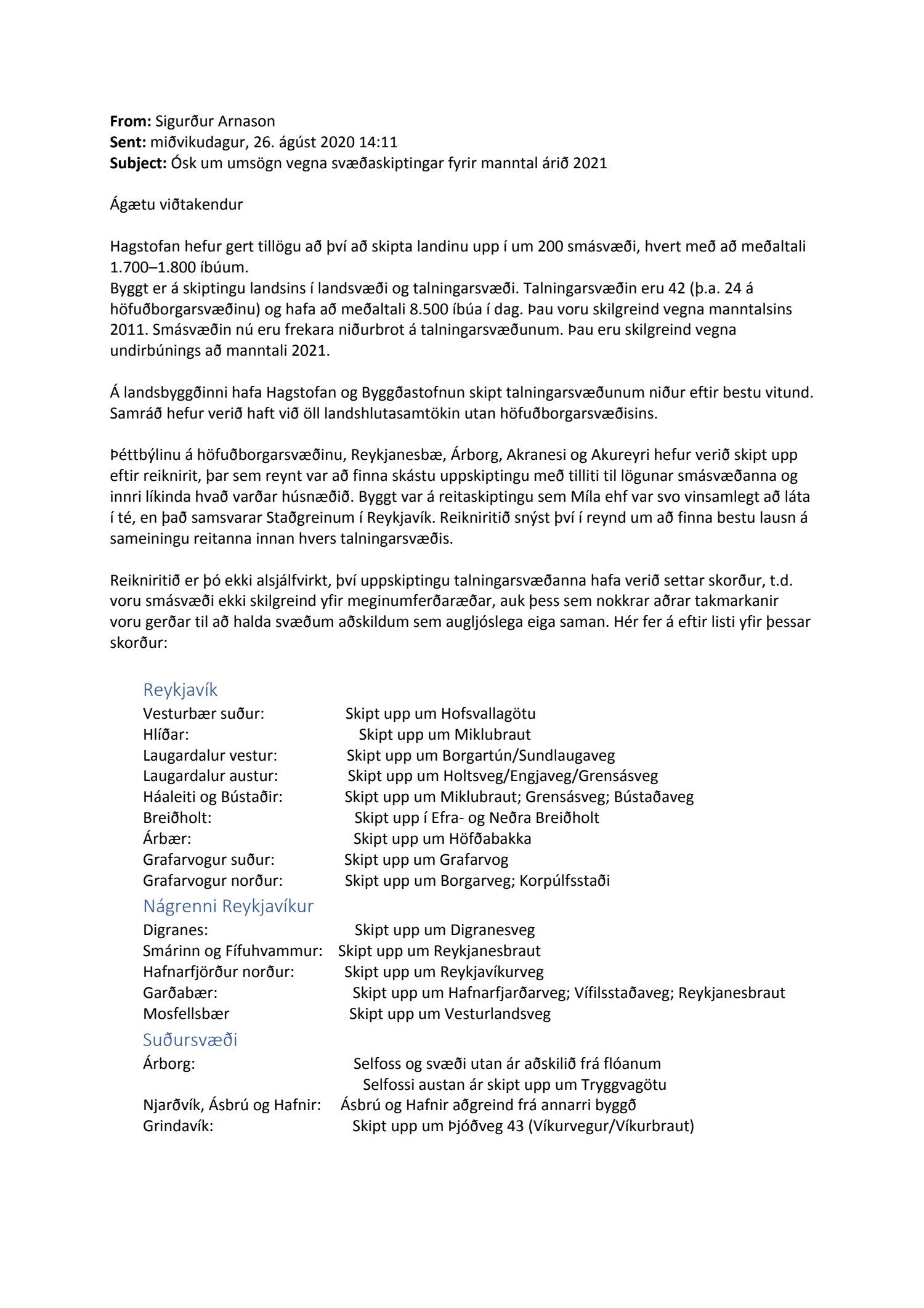 Erindi frá Byggðastofnun, dags. 26. ágúst 2020, þar sem óskað er eftir athugasemdum sveitarstjórna um tillögu að skiptignu landsins í landssvæði og talningarsvæði.