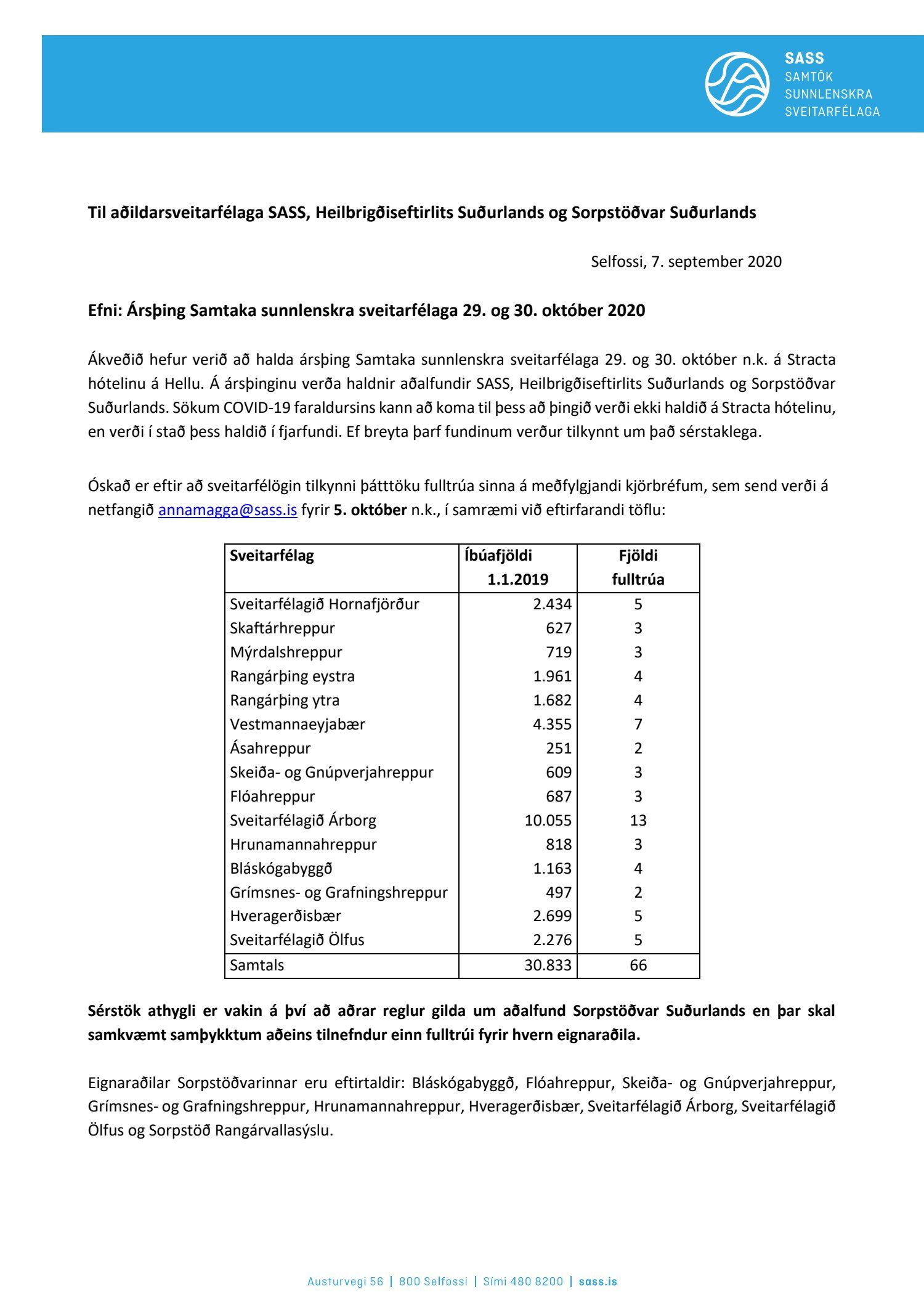 Ákveðið hefur verið að halda ársþing Samtaka sunnlenskra sveitarfélaga 29. og 30. október n.k. á Stracta hótelinu á Hellu.