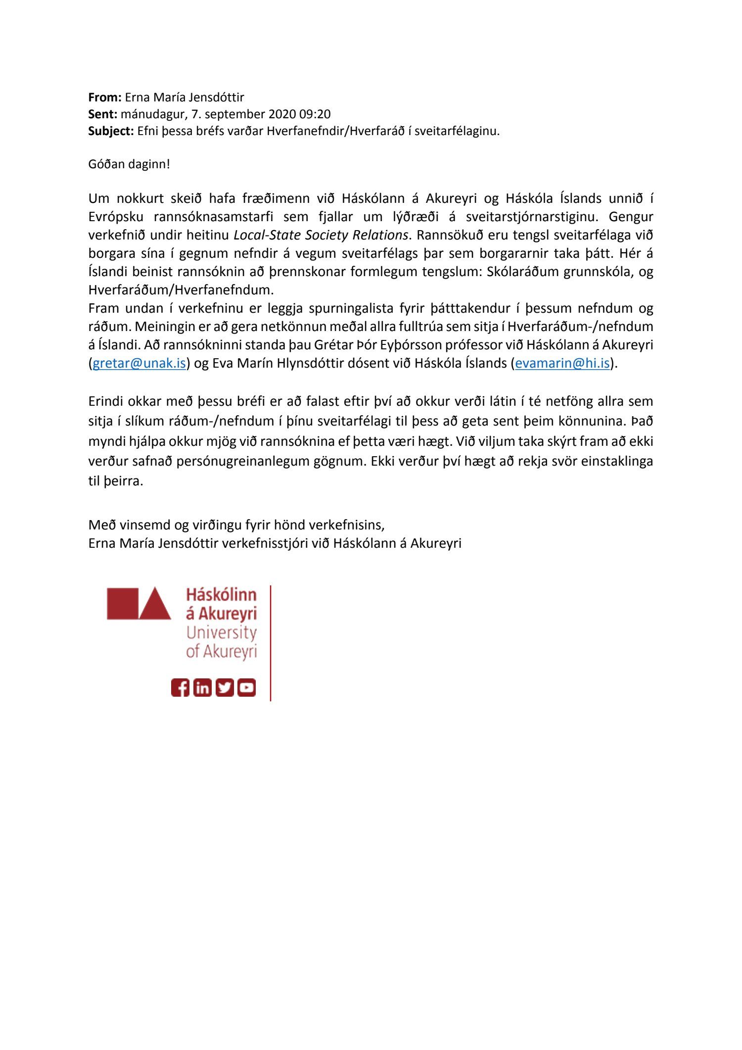 Erindi frá Háskólanum á Akureyri, dags. 7. september 2020, þar sem óskað er eftir netföngum þeirra sem sitja í skólaráðum grunnskóla og hverisráðum sveitarfélagsins.