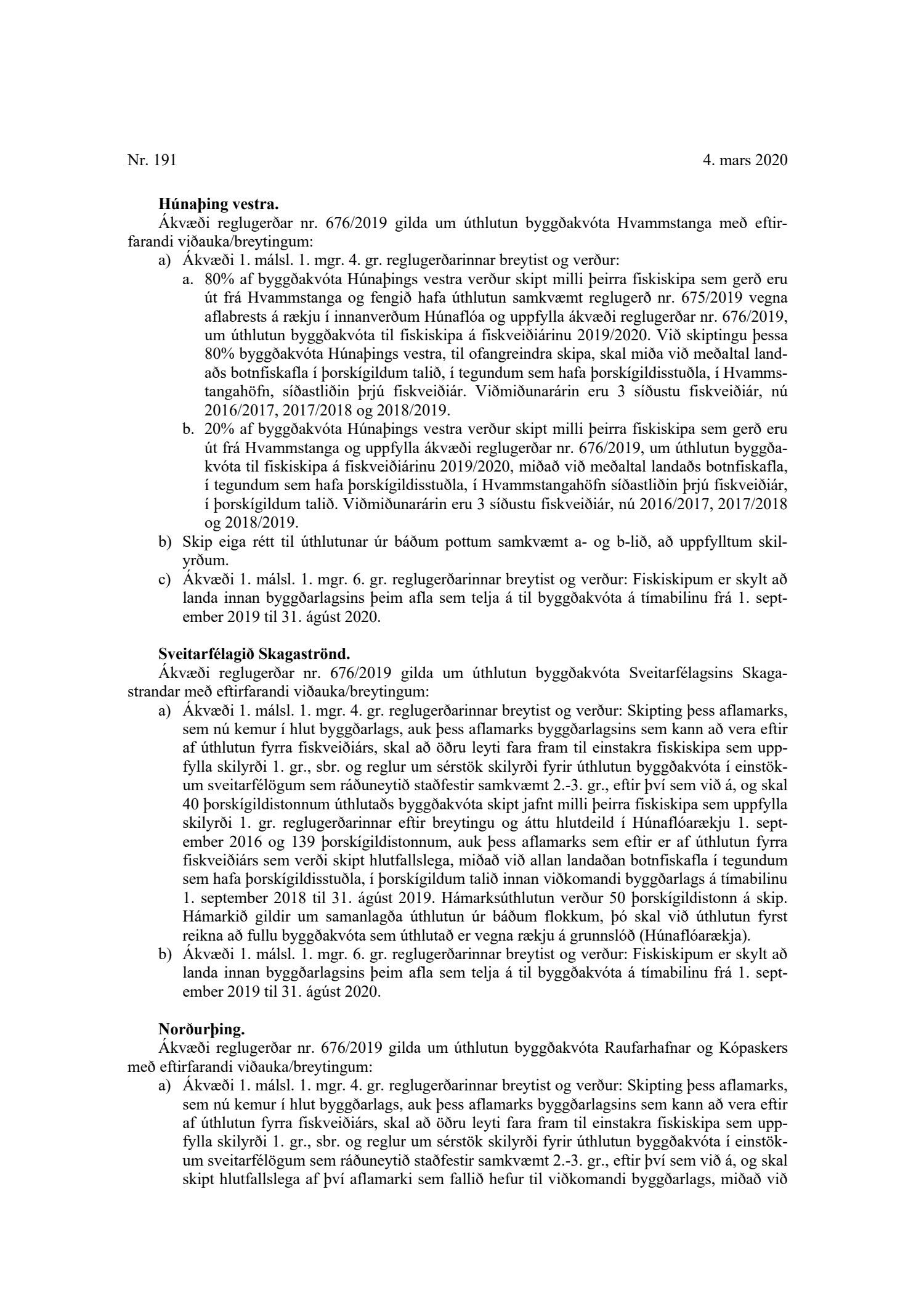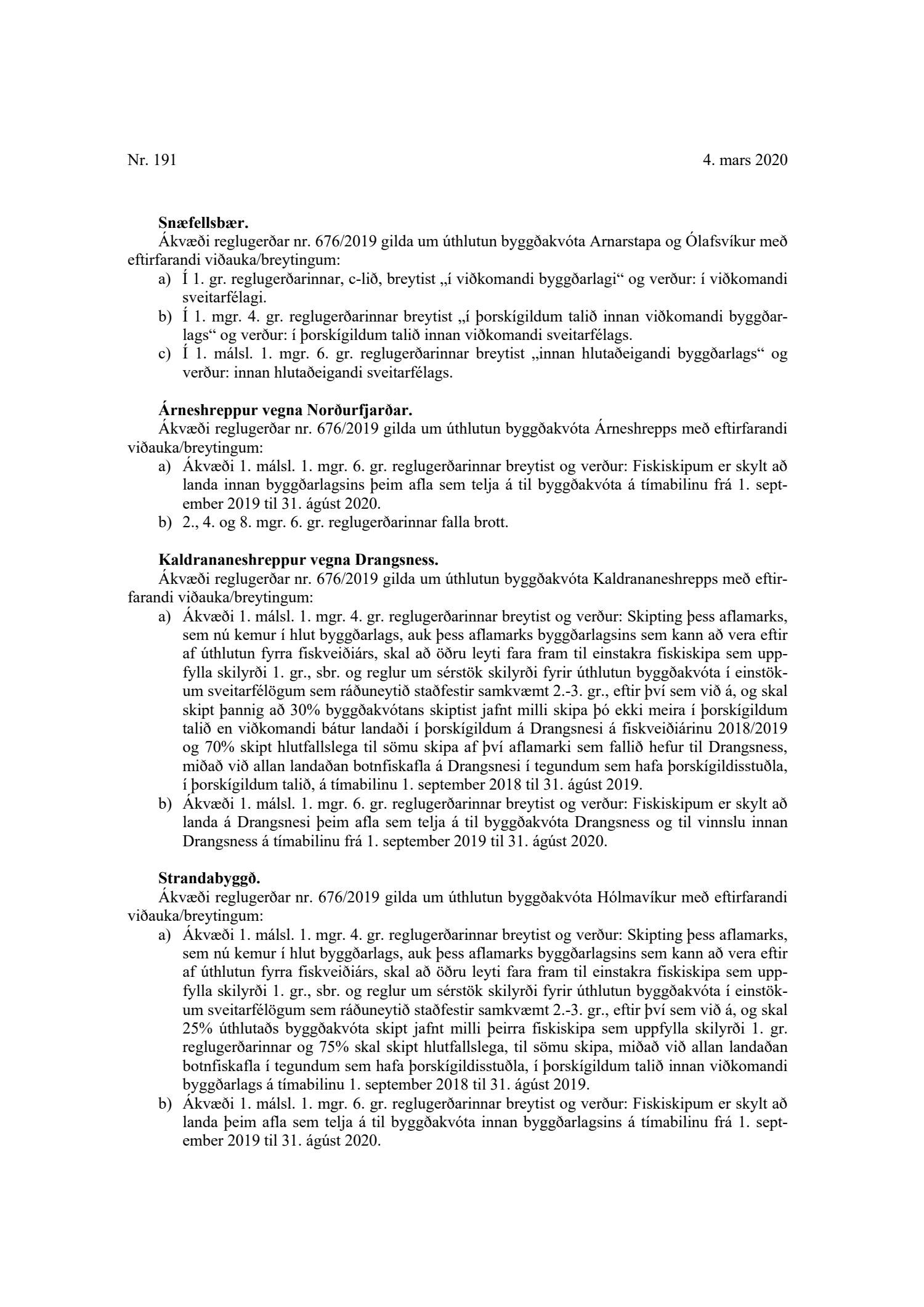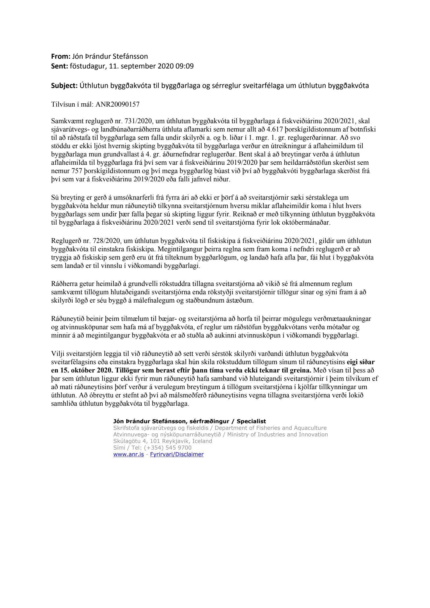 Erindi frá atvinnu- og nýsköpunarráðuneytinu, dags. 11. september 2020, um úthlutun byggðakvóta til byggðarlaga og sérreglur sveitarfélaga um úthlutun byggðakvóta. Vilji sveitarstjórn leggja til að sett verði sérstök skilyrði varðandi úthlutun byggðakvóta sveitarfélagsins eða einstakra byggðarlaga skal skila rökstuddum tillögum til ráðuneytisins eigi síðar en 15. október 2020.