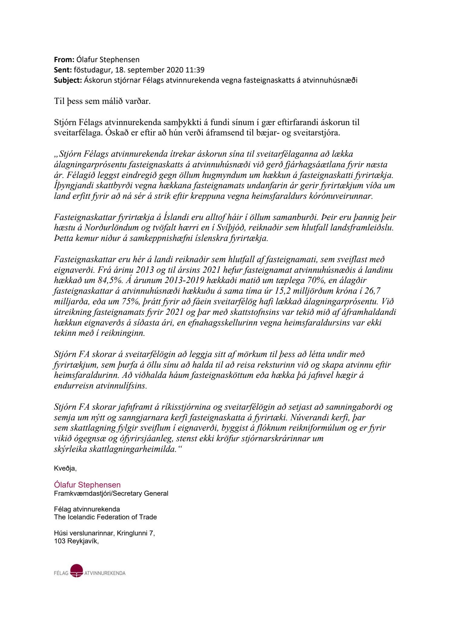 Áskorun frá stjórn Félags atvinnurekenda, dags. 18. september, um að sveitarfélög lækkuðu álagningarprósentu fasteignaskatts á atvinnuhúsnæði við gerð fjárhagsáætlana fyrir næsta ár.