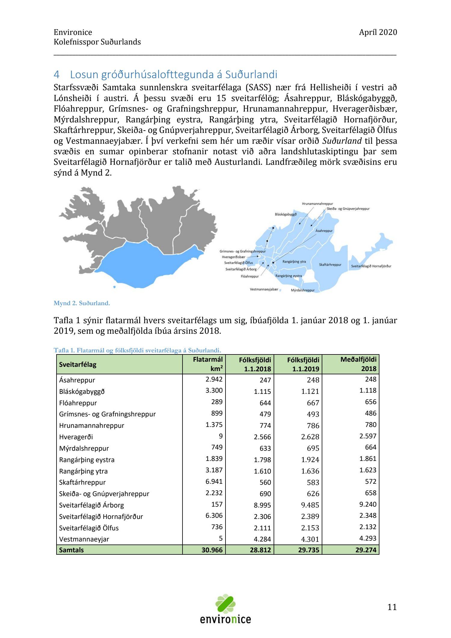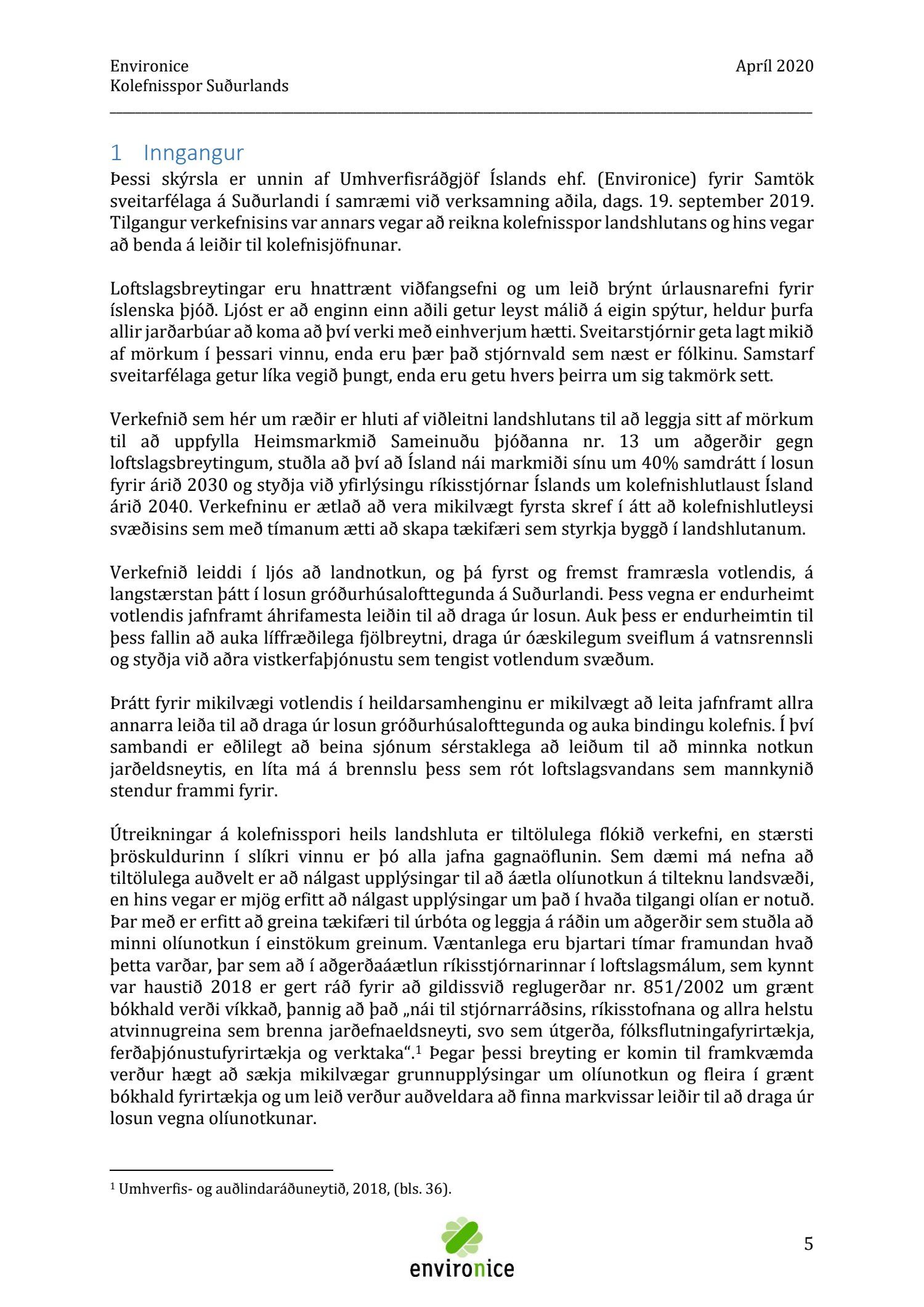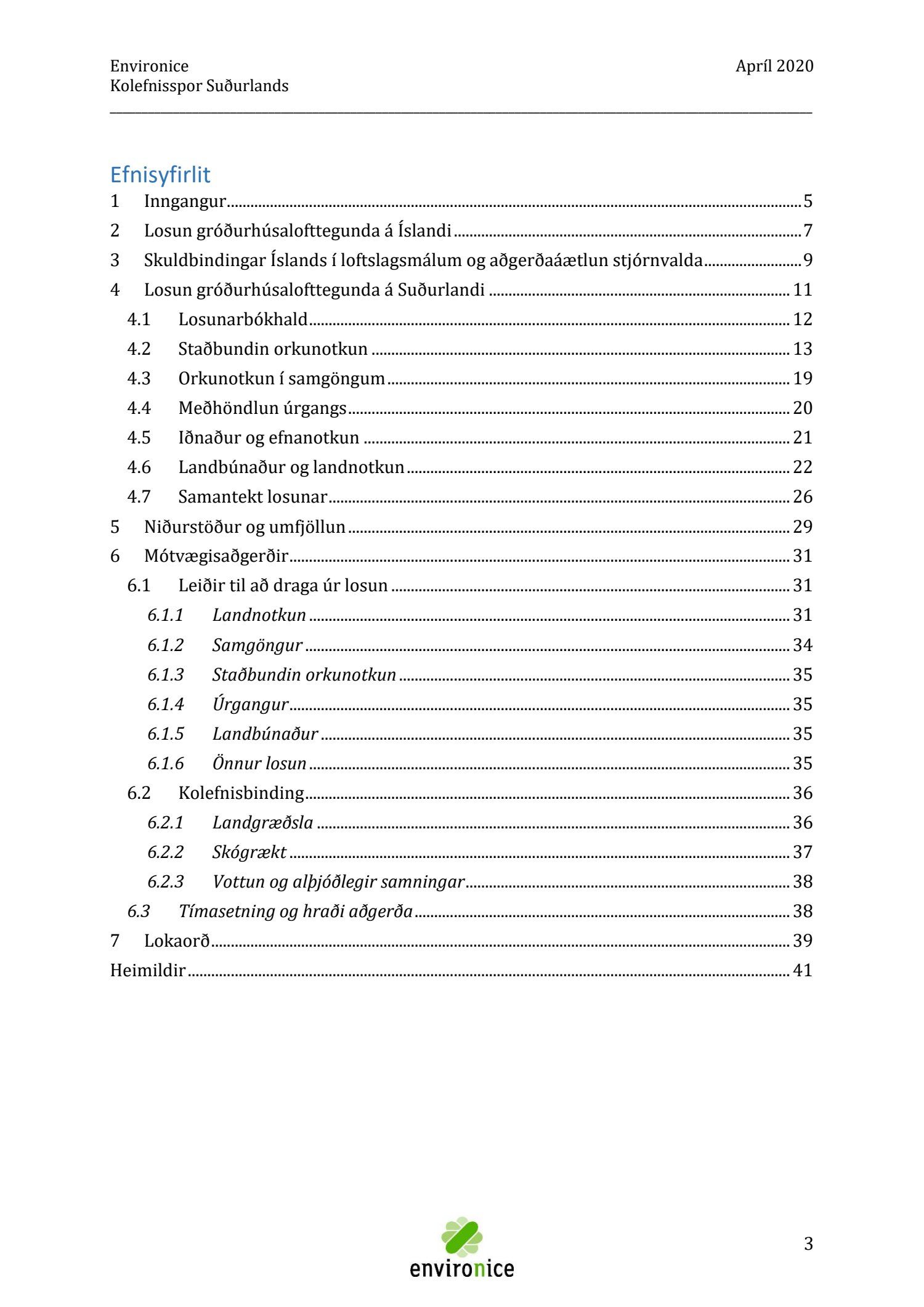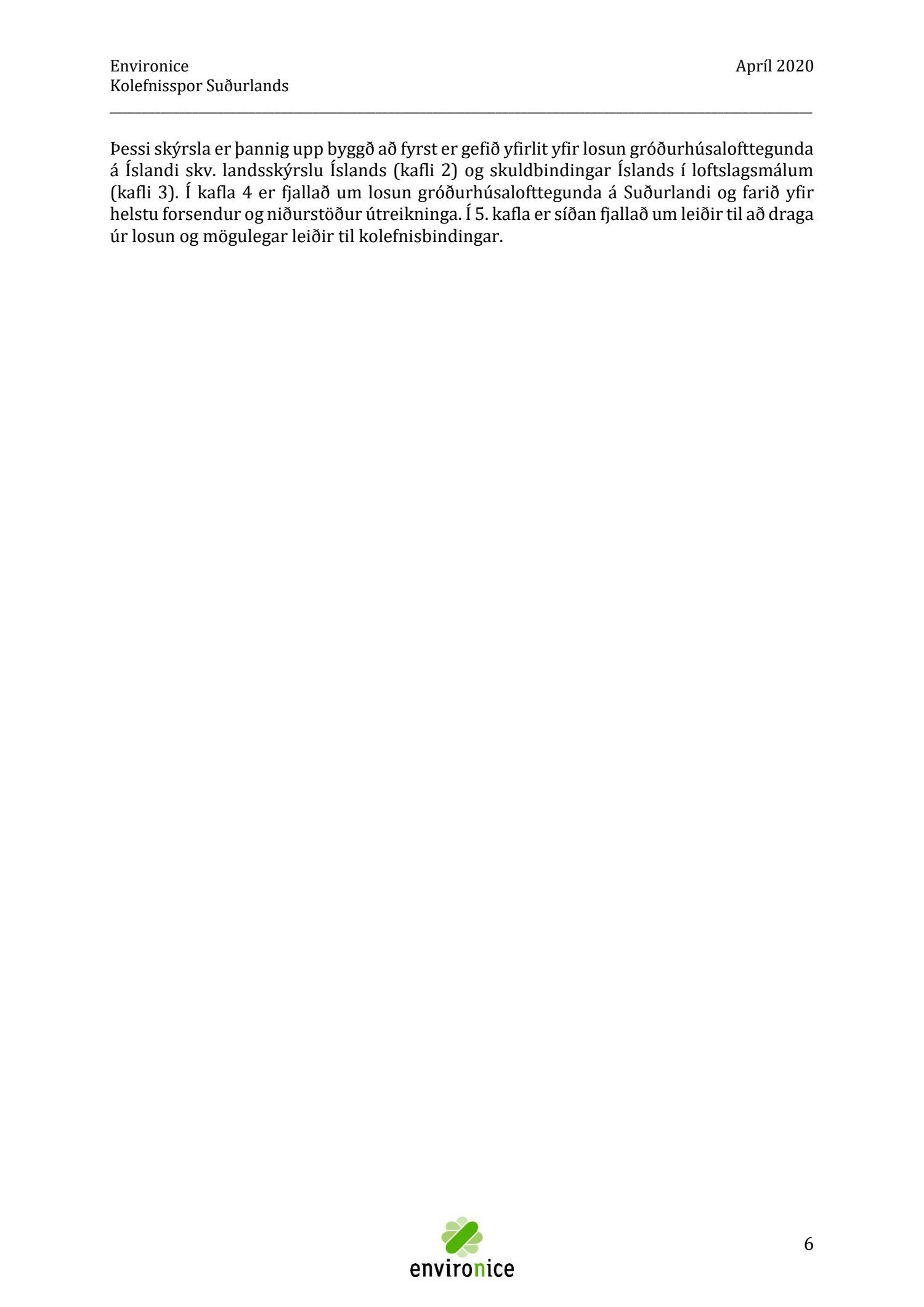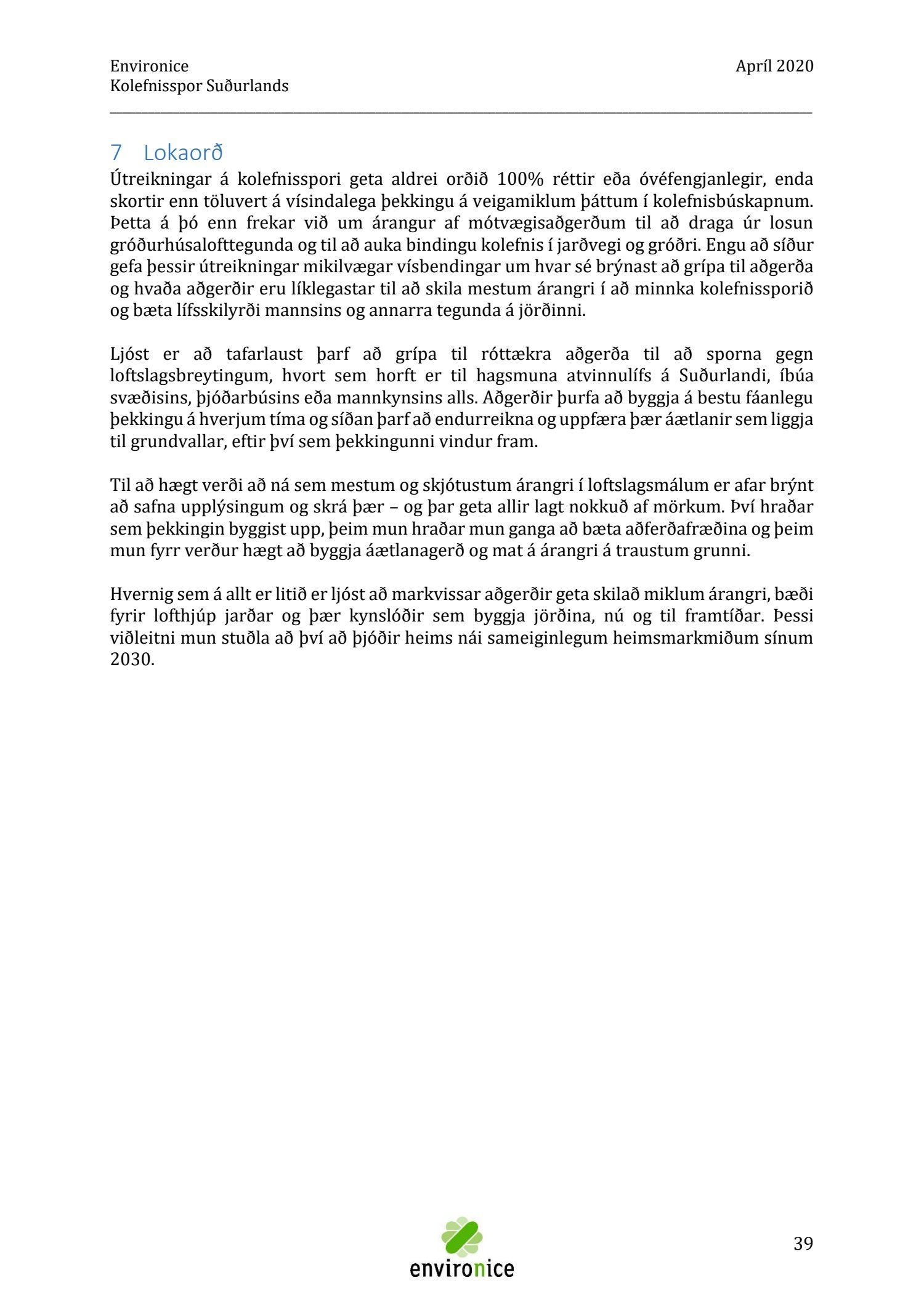Skýrsla sem unnin var af Umhverfisráðgjöf Íslands ehf. (Environice) fyrir SASS. Verkefnið var eitt af áhersluverkefnum Sóknaráætlunar Suðurlands. Tilgangur verkefnisins var annars vegar að reikna kolefnisspor landshlutans og hins vegar að benda á leiðir til kolefnisjöfnunar.