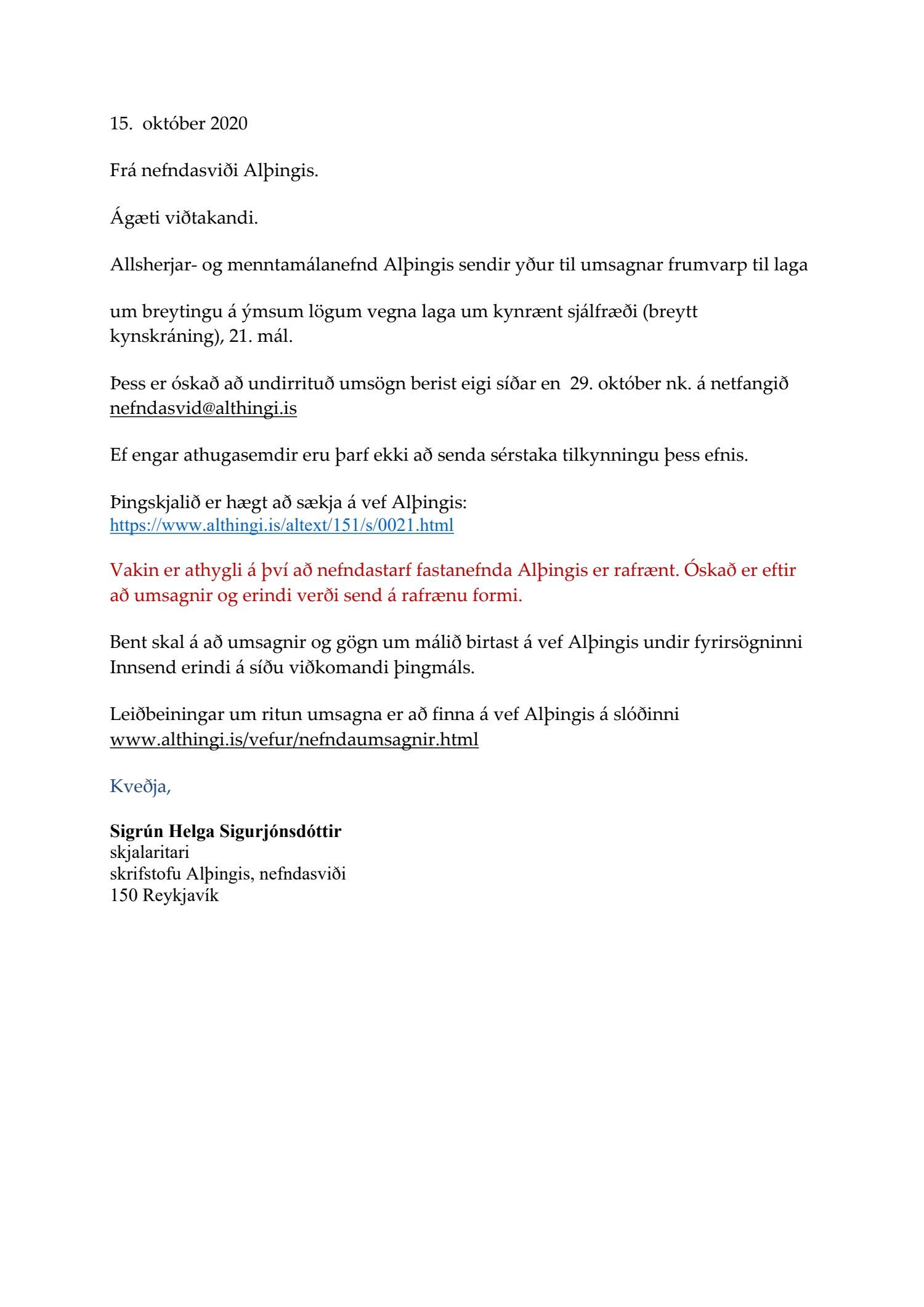 Erindi frá allsherjar- og menntamálanefnd Alþingis, dags. 15. október, þar sem óskað var eftir umsögn um frumvarp til laga um breytingu á ýmsum lögum vegna laga um kynrænt sjálfræði (breytt kynskráning), 21. mál.
