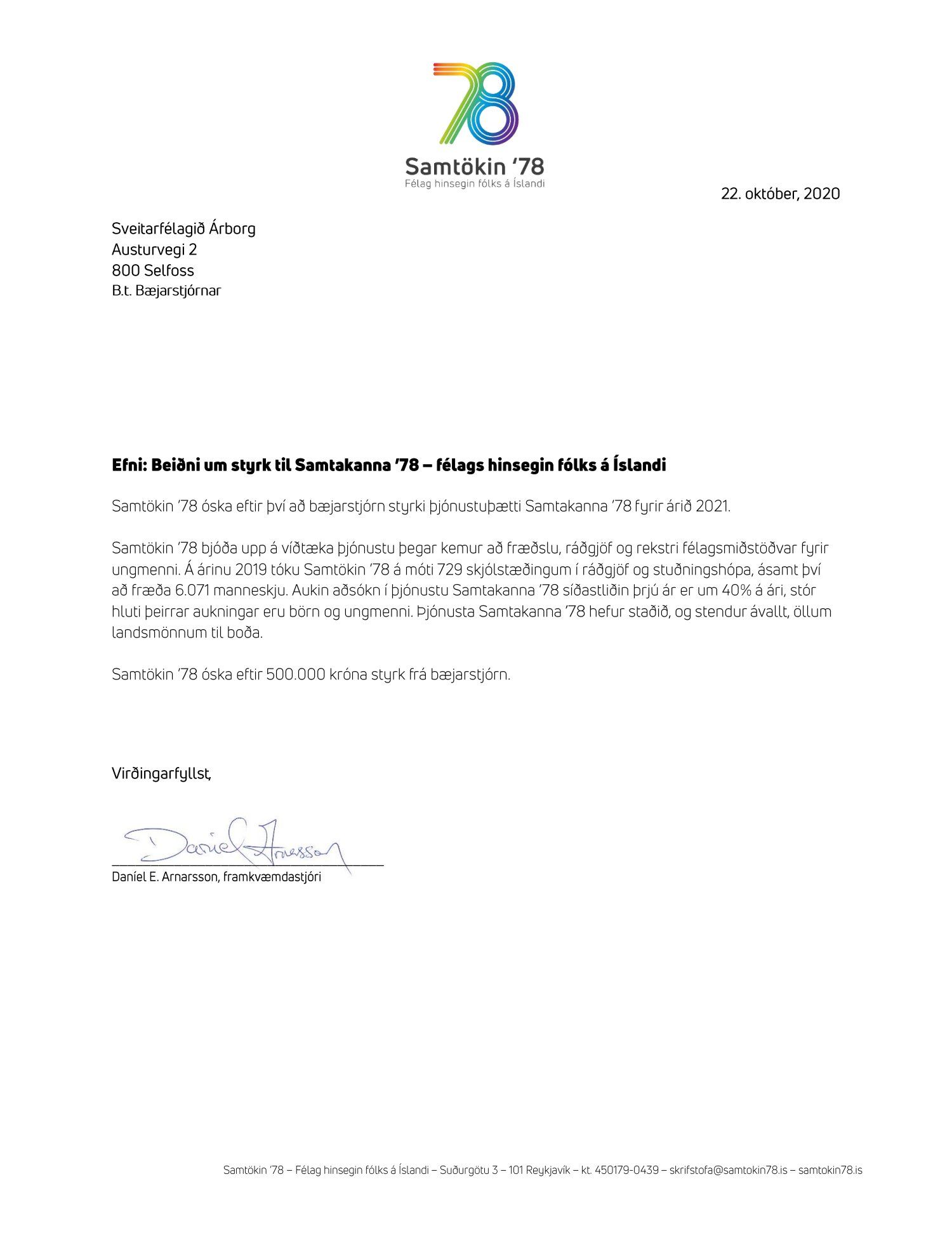 Beiðni frá Samtökum 78 - félags hinsegin fólks á Íslandi, dags. 22. október, þar sem óskar er styrk kr. 500.000, - til að styrkja þjónustuþætti Samtakann ´78 fyrir árið 2021.