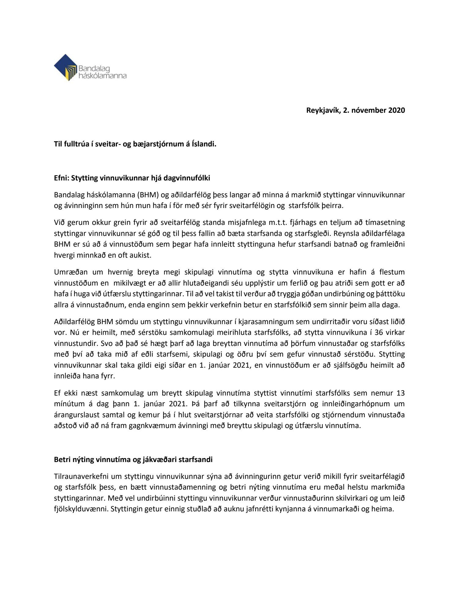 Erindi frá BHM, dags. 2. nóvember, um styttingu vinnuviku hjá dagvinnufólki.