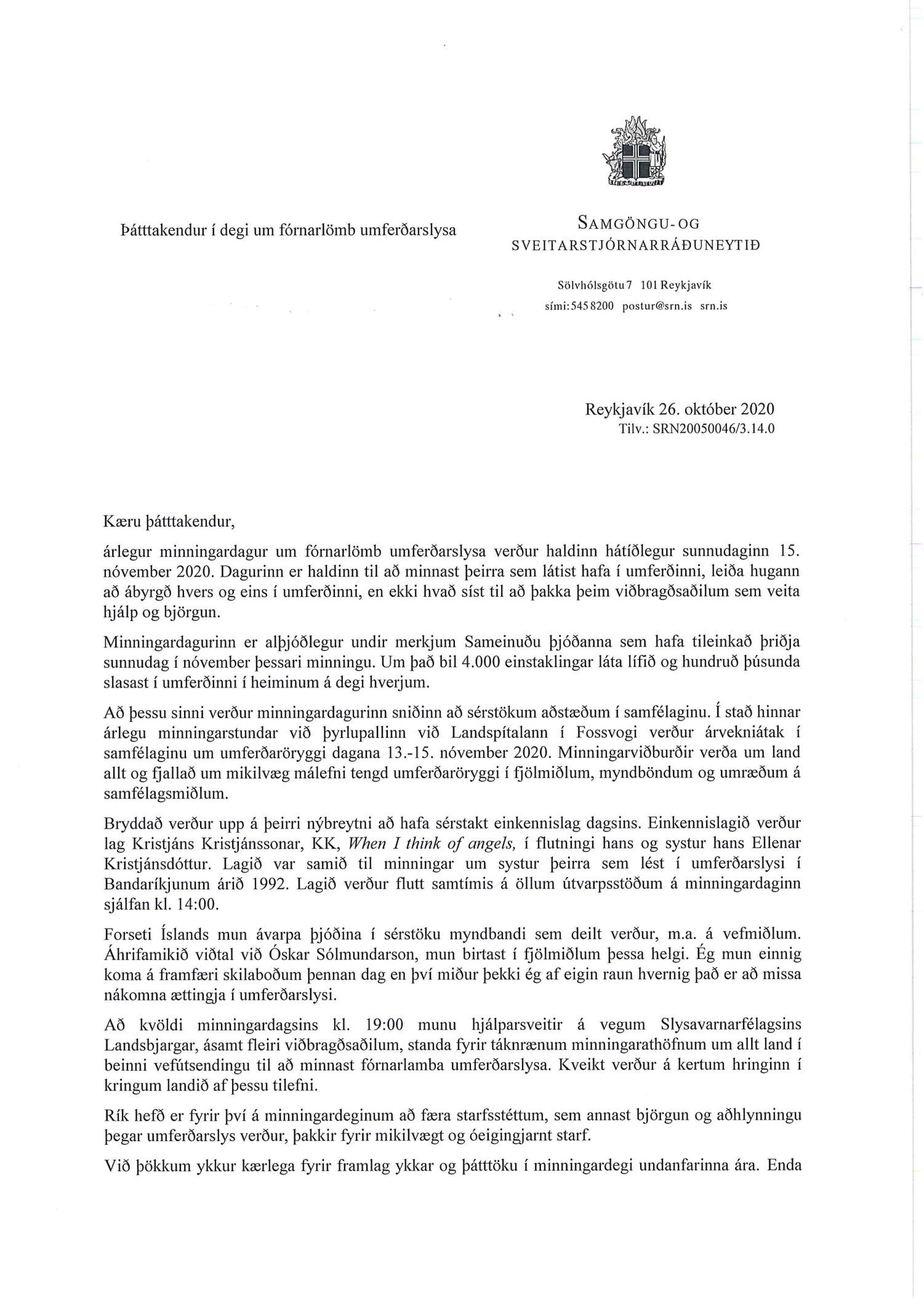 Bréf frá samgöngu- og sveitarstjórnarráðherra, dags. 26. október, um minngardag um fórnarlömb umferðarslysa sem haldinn verður 15. nóvember nk.