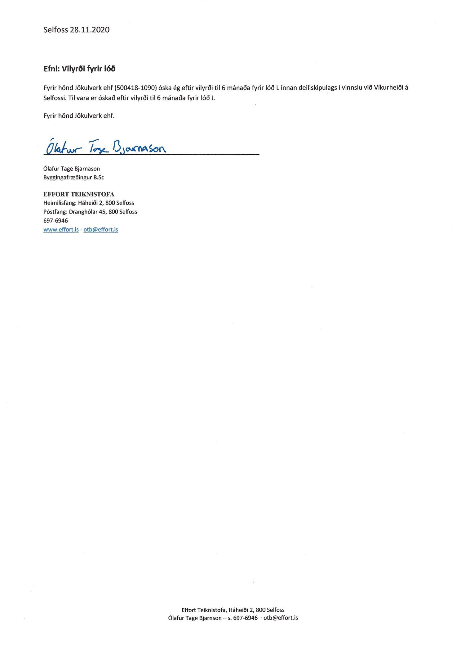 Beiðni frá Jökulverk ehf, dags. 28. nóvember, þar sem óskað var eftir viðyrði fyrir lóð nr. L við Víkurheiði á Selfossi. Sótt er um lóð nr. I til vara.