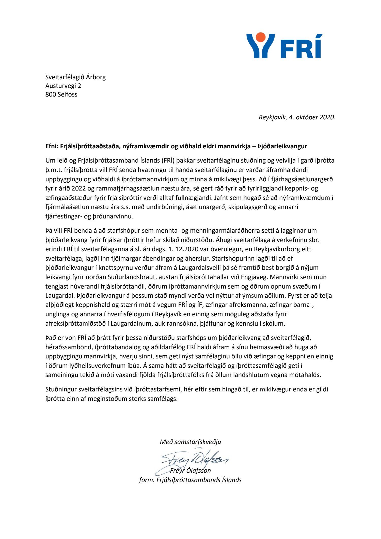 Erindi frá Frjálsíþróttasambandi Íslands, dags. 4. október, þar sem sveitarfélög voru hvött til að gera ráð fyrir í fjárhagsáætlunargerð fyrir árið 2022 áframhaldandi uppbyggingu og viðhaldi á íþróttamannvirkjum.