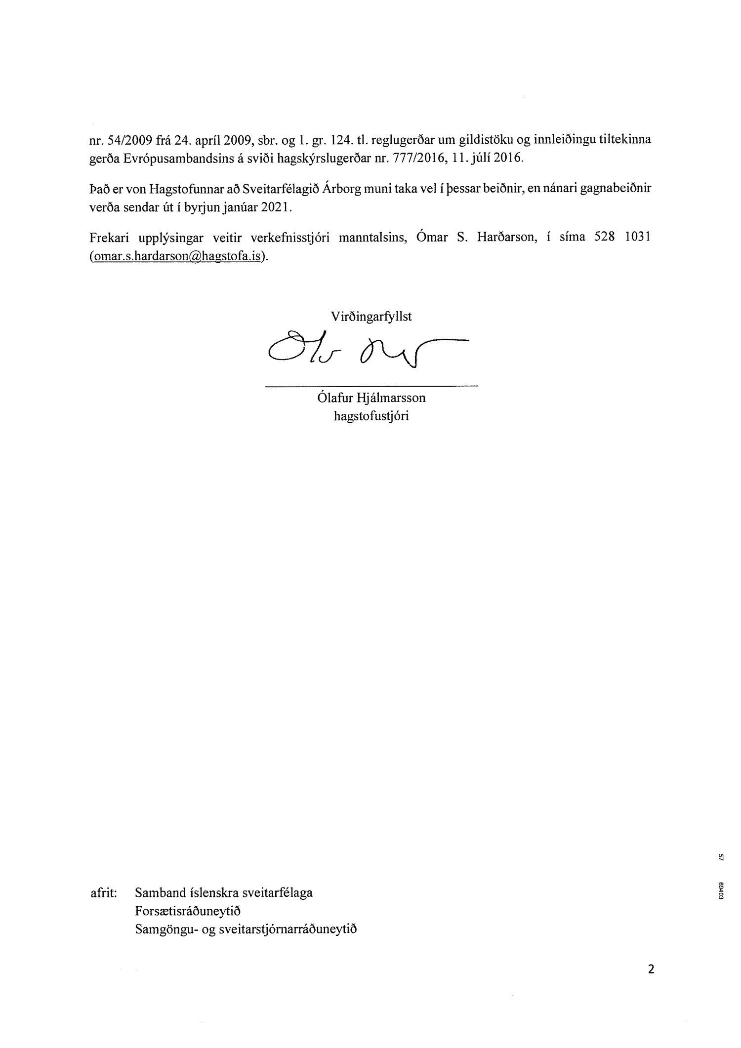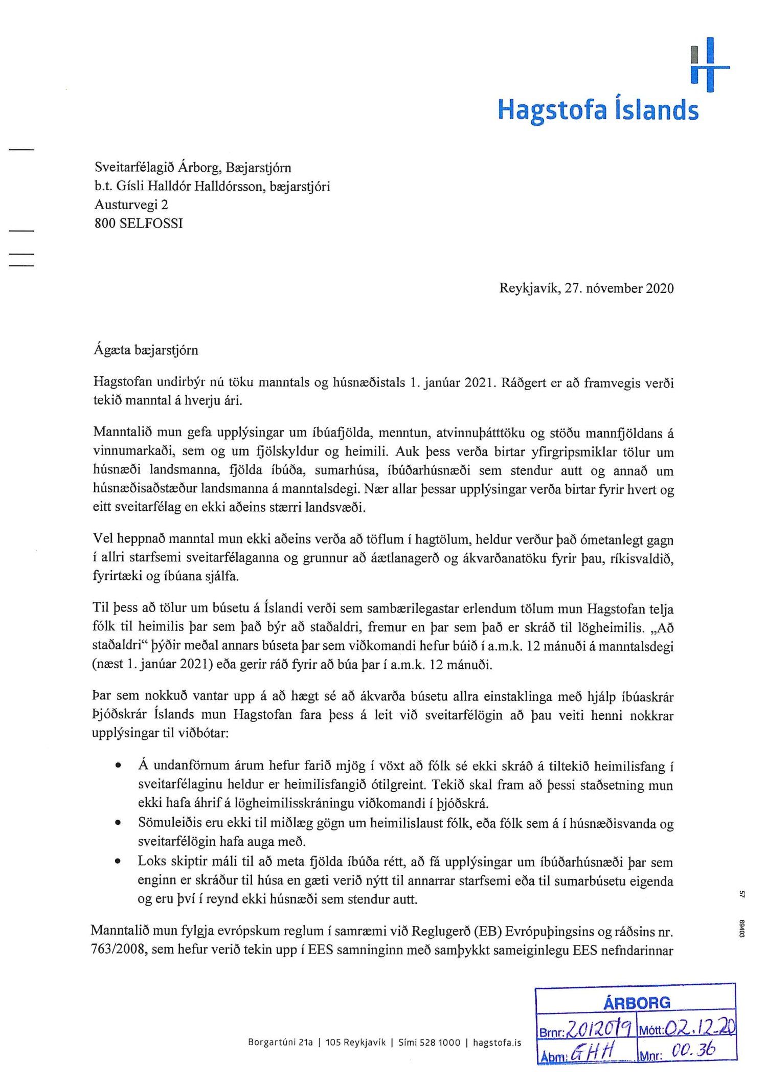 Erindi frá Hagstofu Íslands, dags. 27. nóvember, þar sem óskað var eftir að Sveitarfélagið Árborg taki vel í að senda gagnabeiðnir vegna fyrirhugaðs manntals og húsnæðistals.