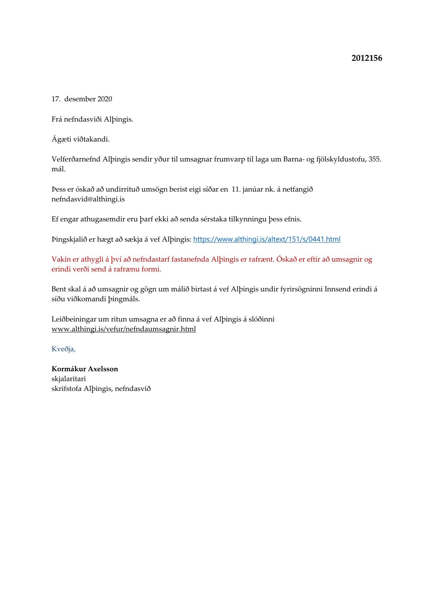 Bæjarráð fagnar þessu frumvarpi en Barna- og fjölskyldustofa er ætti að auðvelda ríki og sveitarfélögum að efla þjónustu við börn og vinna enn betur að velferð þeirra. Hins vegar er eðlilegt að bæta við síðustu setningu í 3. grein frumvarpsins þar sem fjallað er um meginhlutverk.