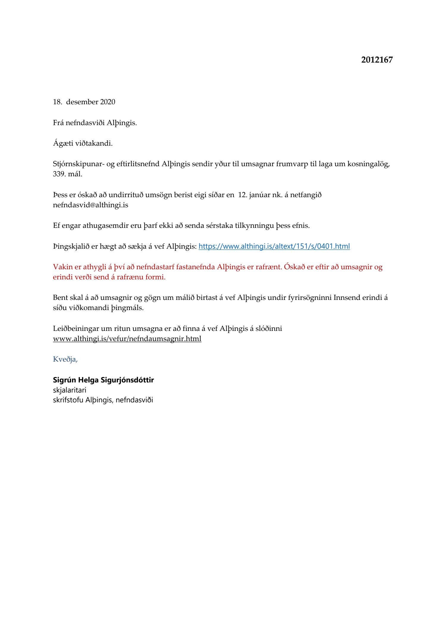 Umsögn - frumvarp til laga um kosningalög, 339. mál