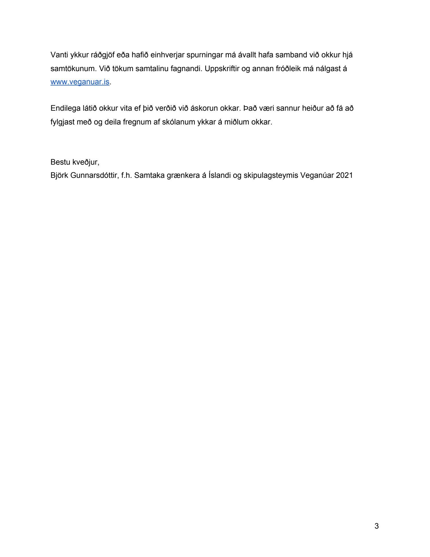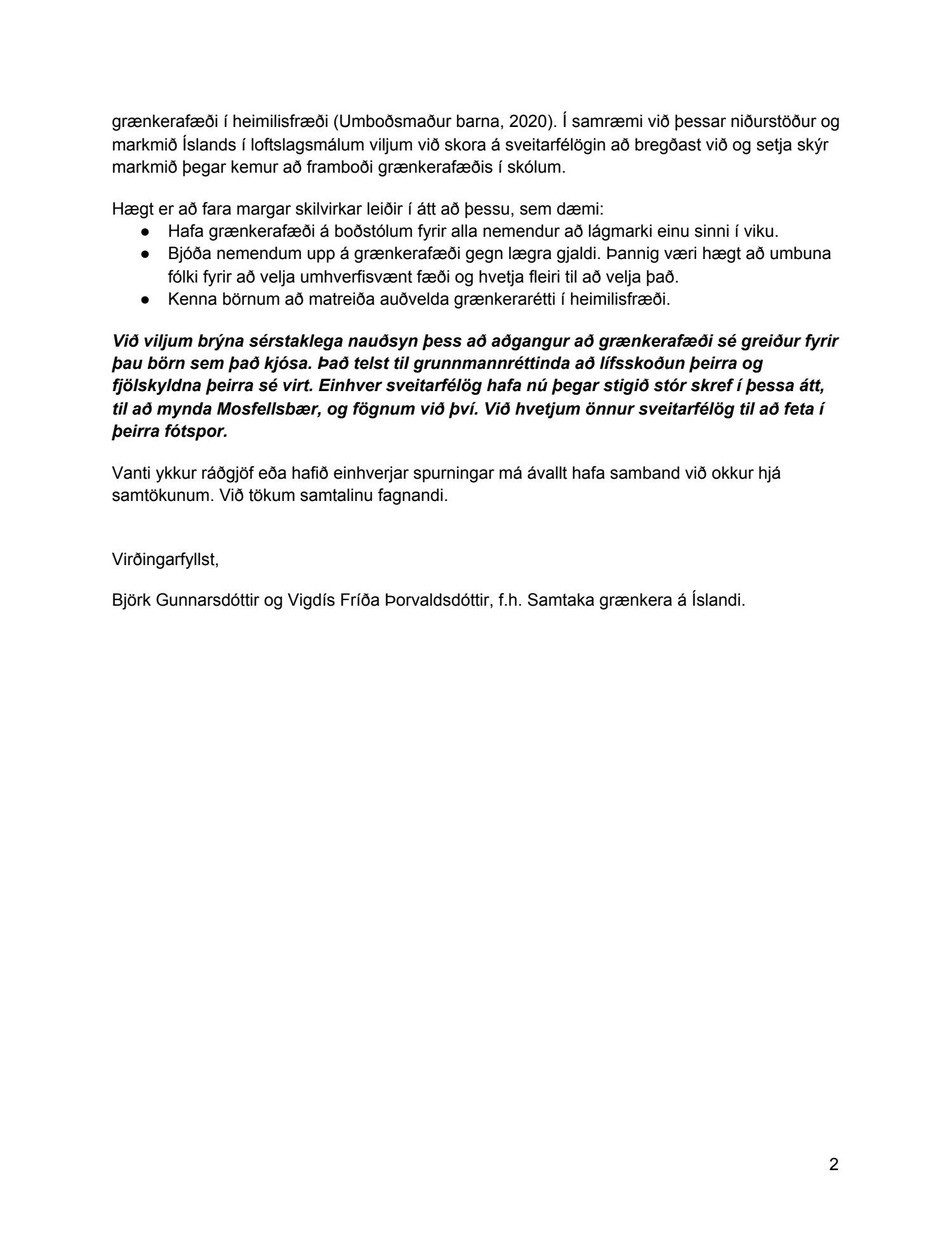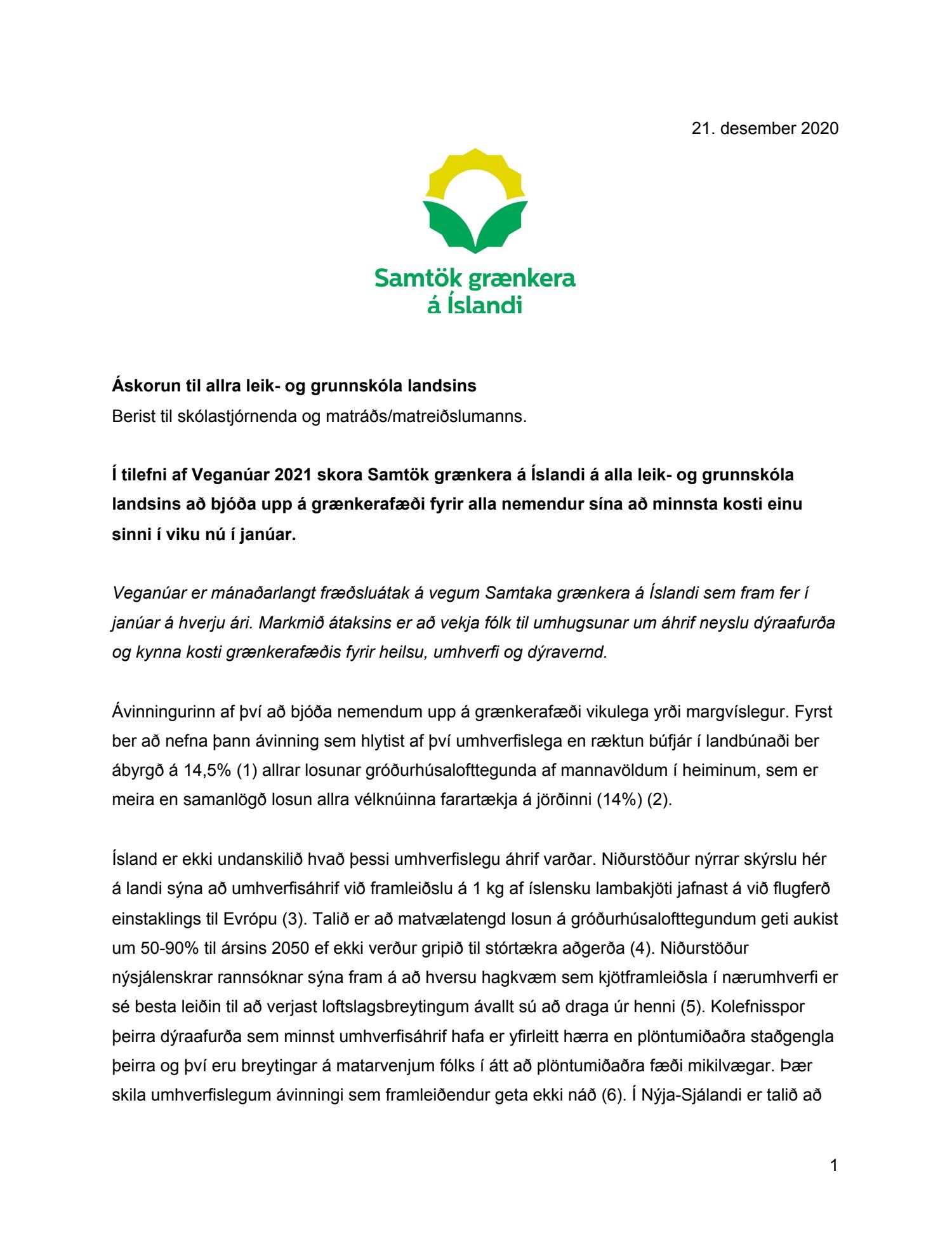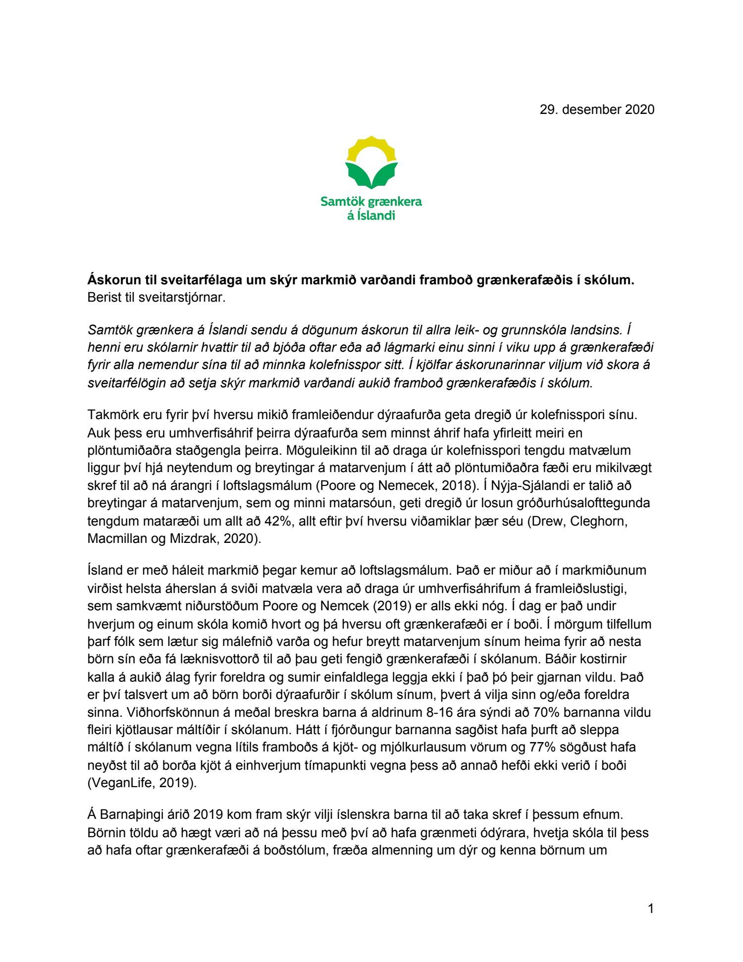 Áskorun til sveitarfélaga um skýr markmið varðandi framboð grænkerafæðis í skólum, dags. 29. desember.