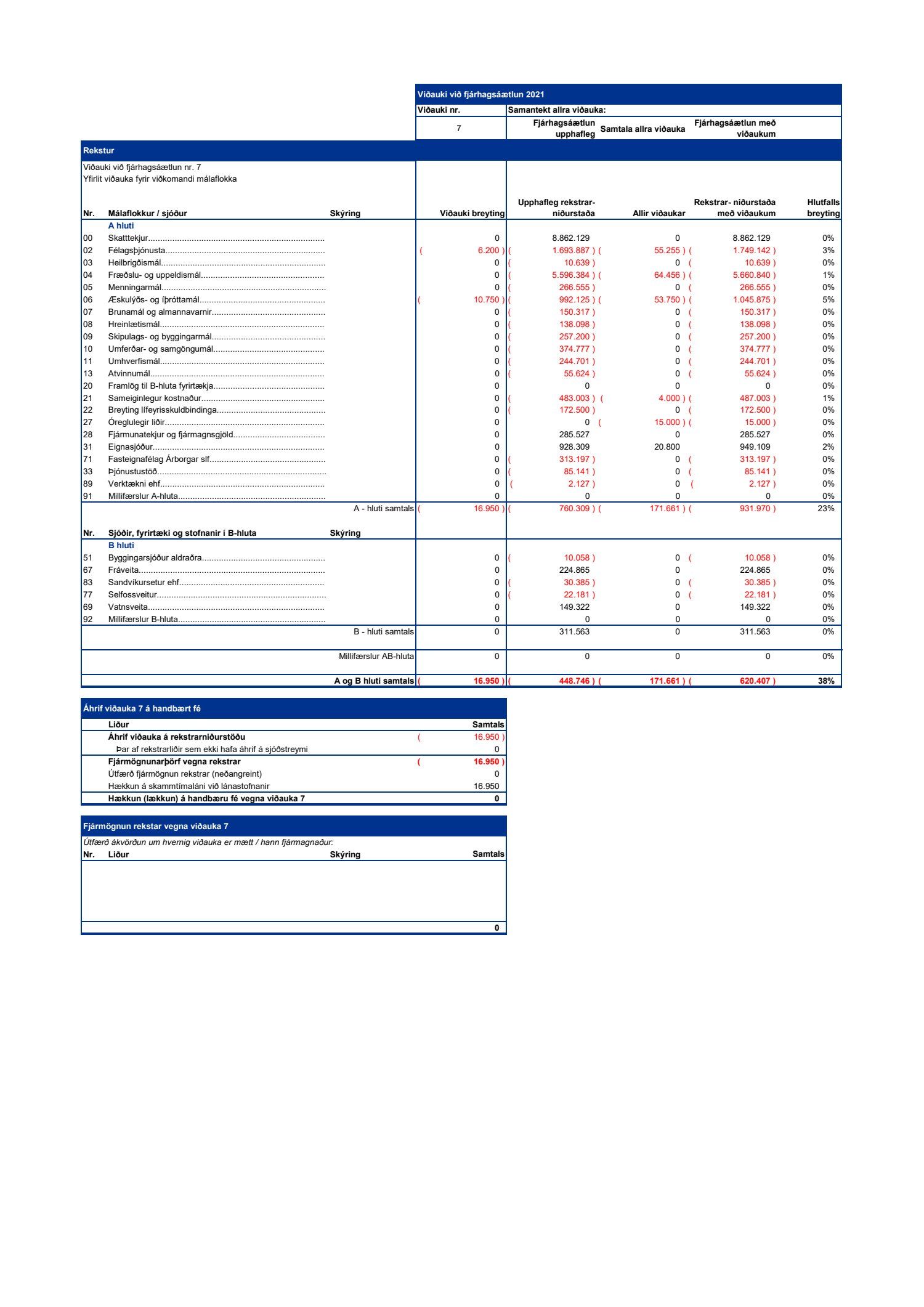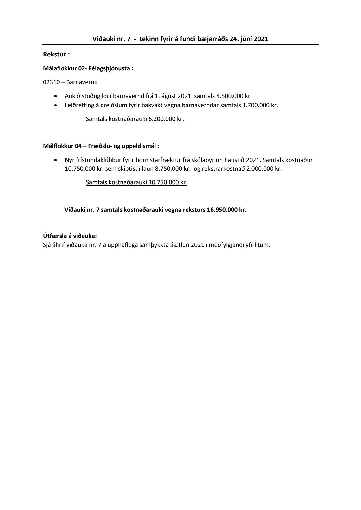 Viðauki nr. 7 samtals kostnaðarauki vegna reksturs 16.950.000 kr.