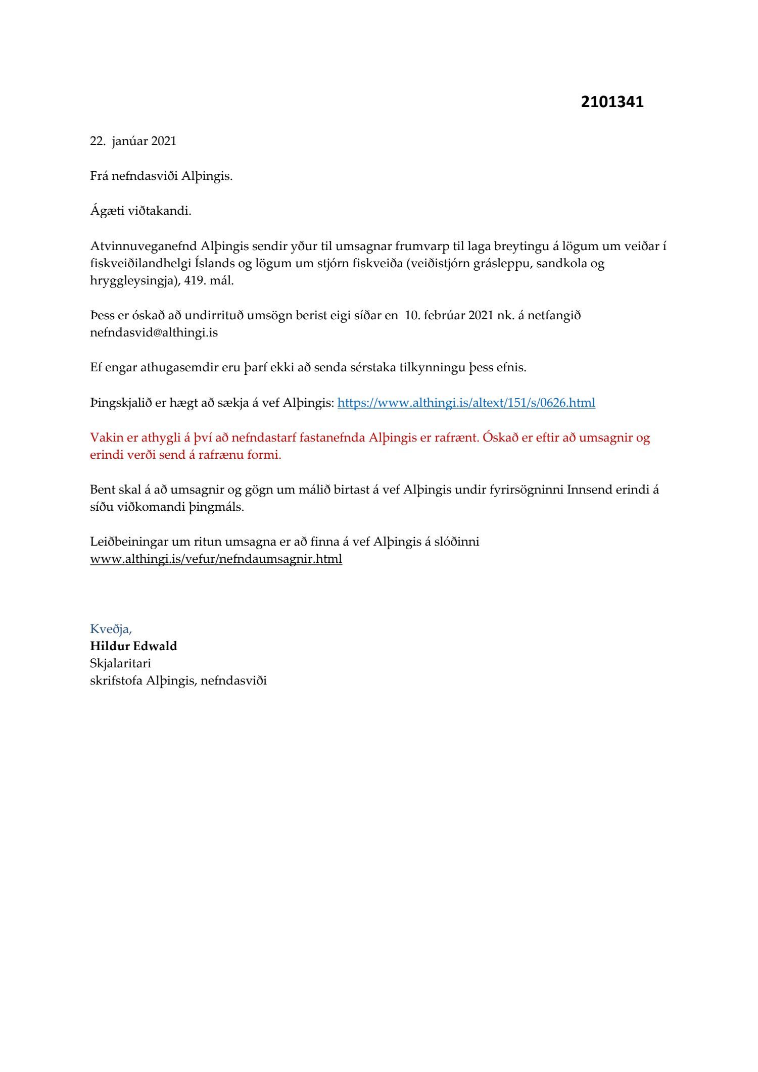 Erindi frá atvinnuveganefnd Alþingis, dags. 22. janúar, þar sem óskað var eftir umsögn um frumvarp til laga um breytingu á lögum um veiðar í fiskveiðilandhelgi Íslands og lögum um stjórn fiskveiða (veiðistjórn grásleppu, sandkola og hryggleysingja), 419. mál.
