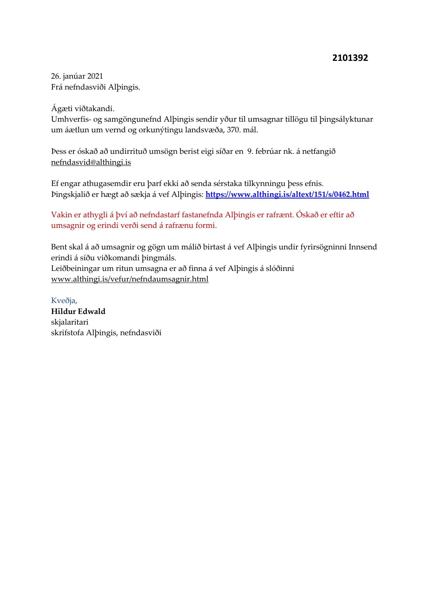 Erindi frá umhverfis- og samgöngunefnd Alþingis, dags. 26. janúar, þar sem óskað var eftir umsögn um tillögu til þingsályktunar um áætlun um vernd og orkunýtingu landsvæða, 370. mál.