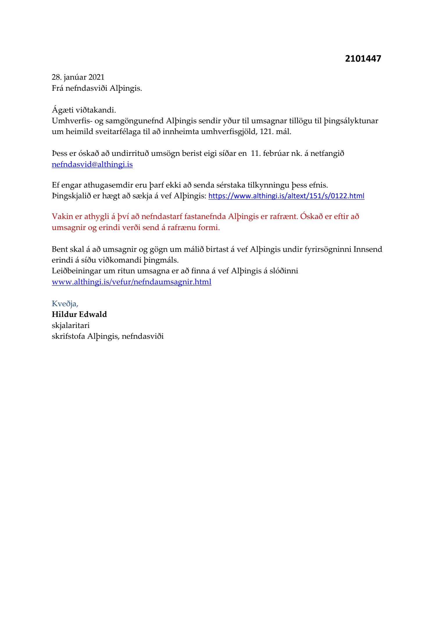 Erindi frá umhverfis- og samgöngunefnd Alþingis, dags. 28. janúar, þar sem óskað var eftir umsögn um tillögu til þingsályktunar um heimild sveitarfélaga til að innheimta umhverfisgjöld, 121. mál.