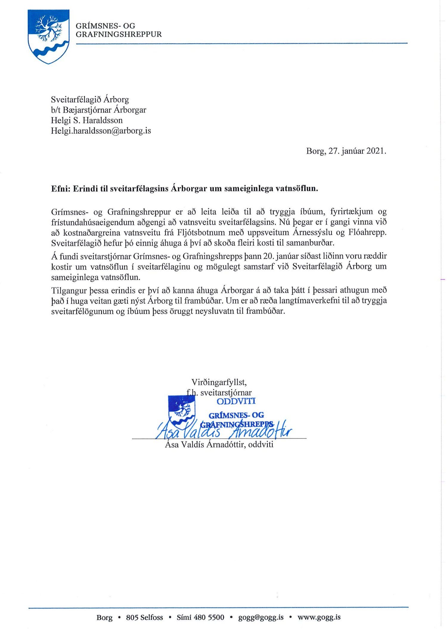 Bæjarráð tekur jákvætt í erindið og lýsir yfir vilja sveitarfélagsins til að taka þátt í athugun á grundvelli sameiginlegrar vatnsöflunar.