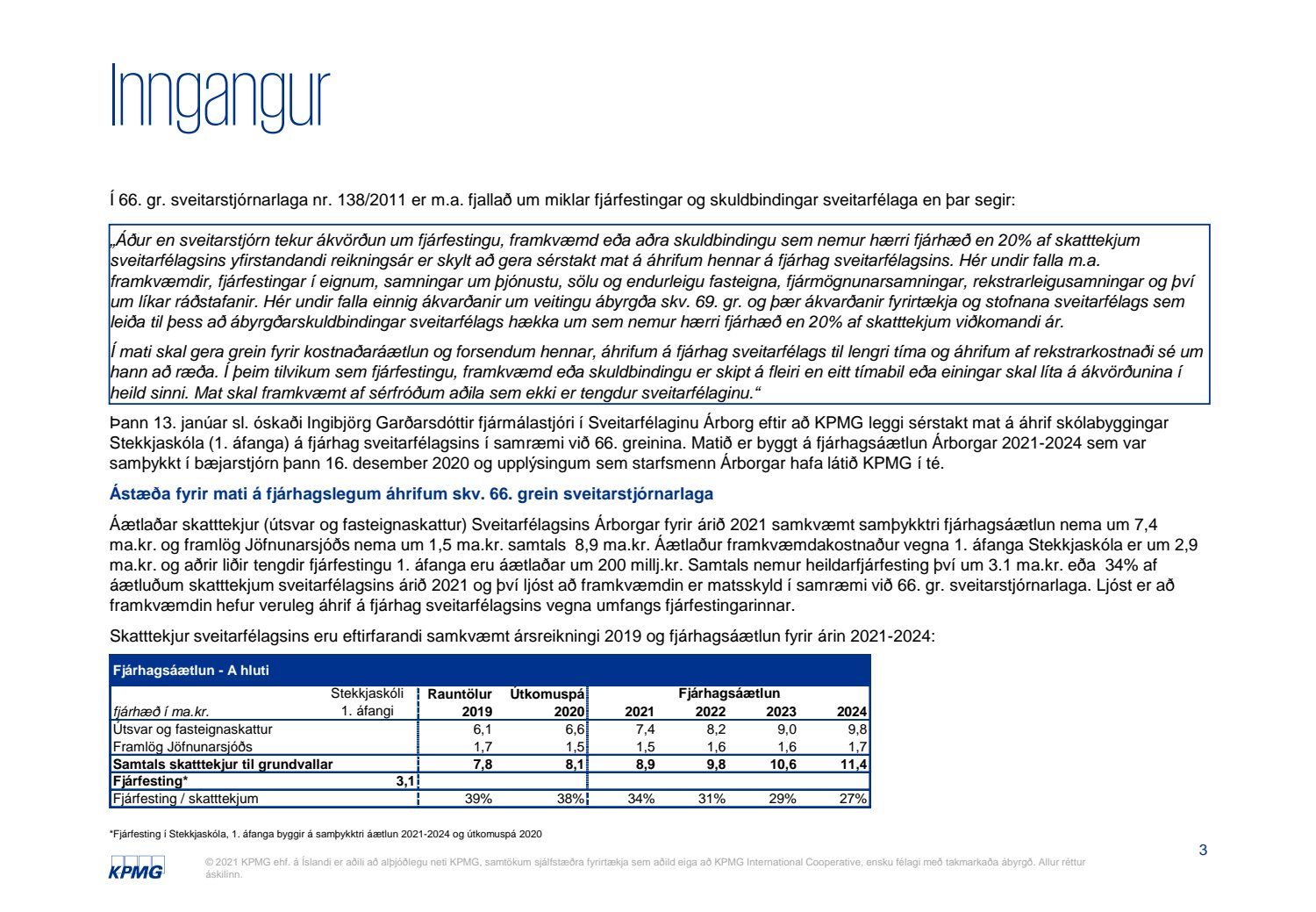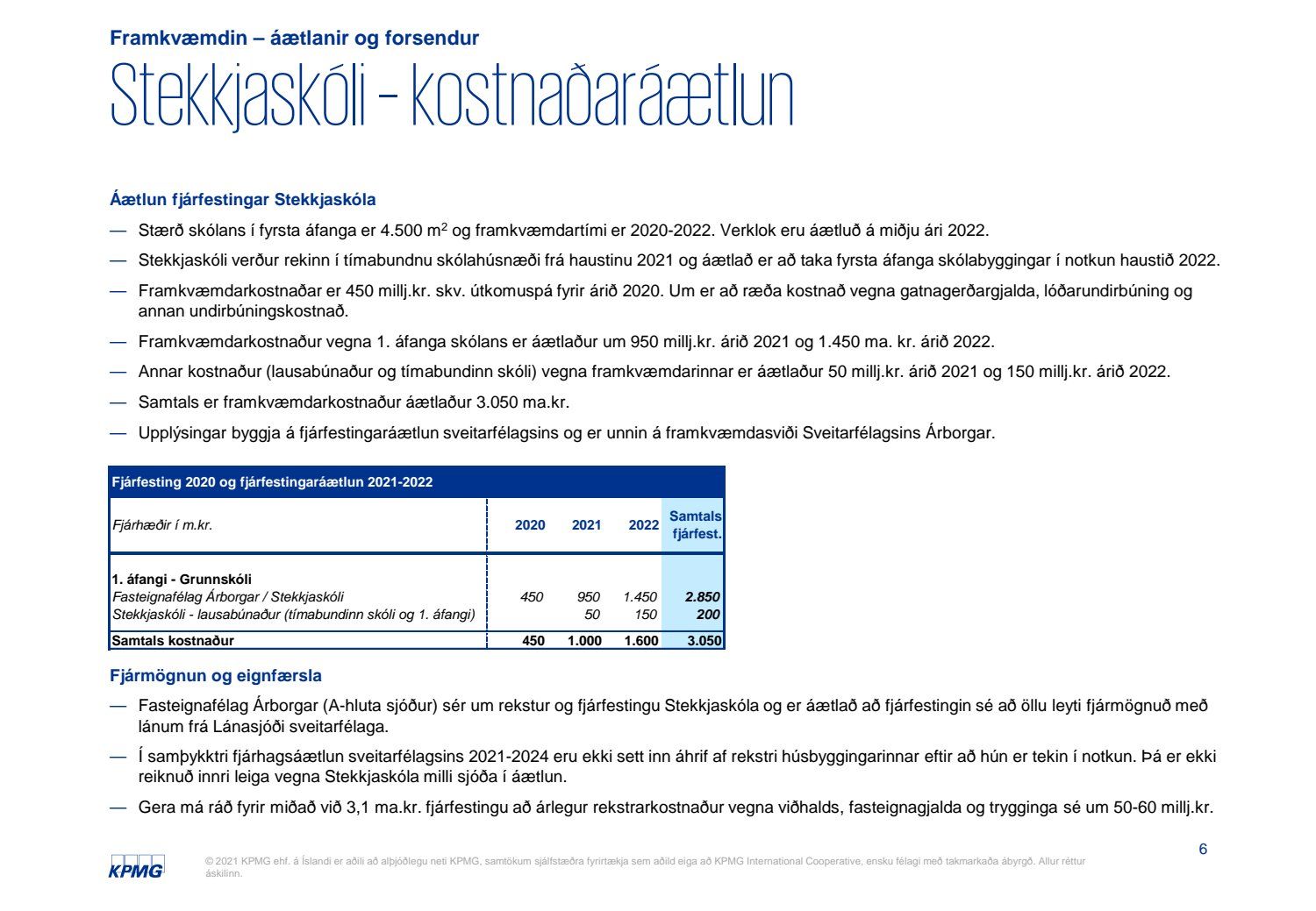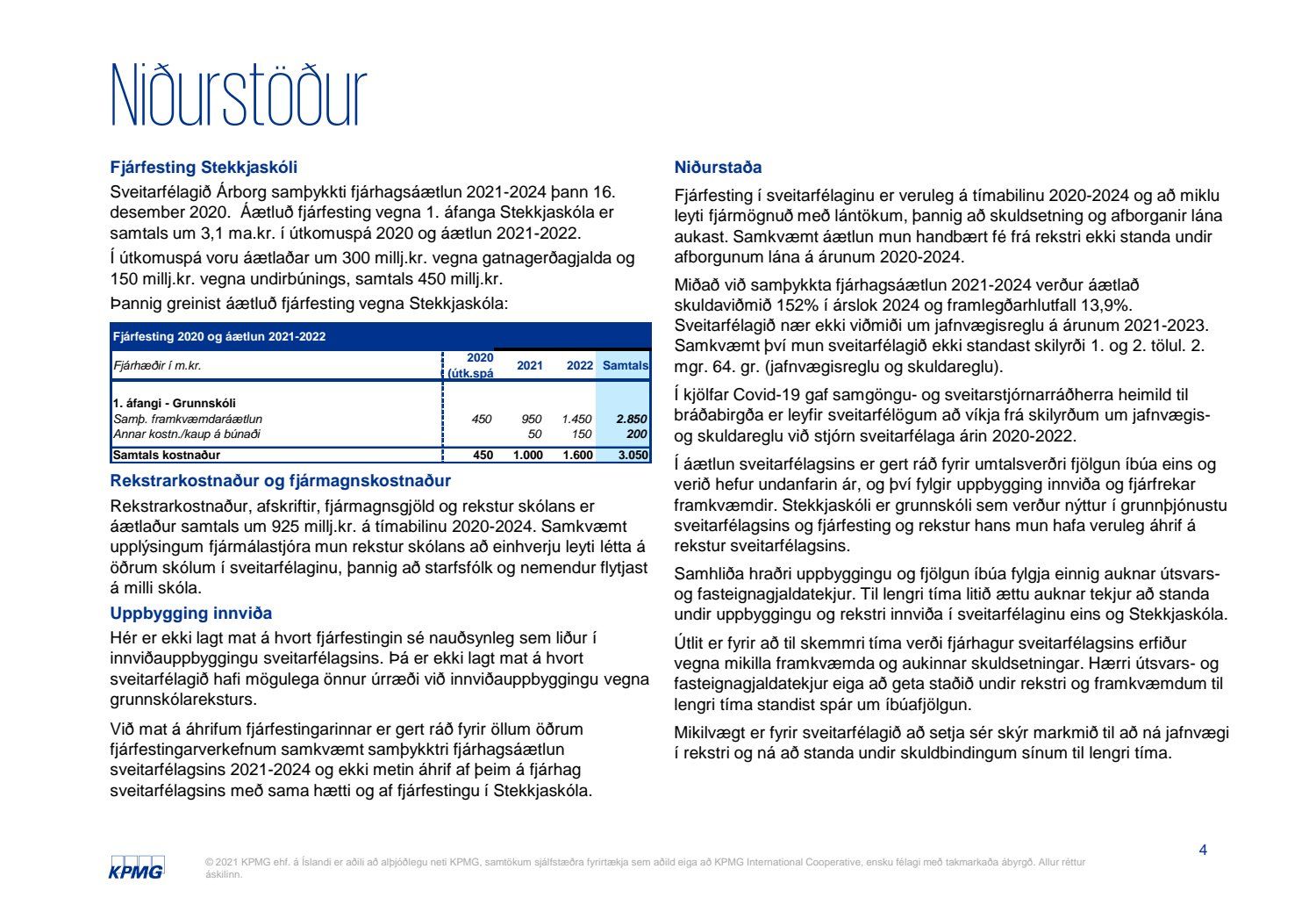 Skýrsla KPMG um mat á fjárhagslegum áhrifum fjárfestingar í Stekkjarskóla skv. 66. gr. sveitarstjórnarlaga nr. 138/2011.