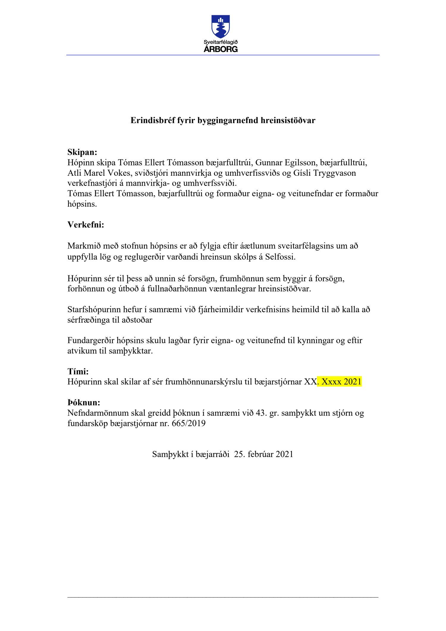 Bæjarráð samþykkir stofnun starfshópsins og erindsbréf fyrir hann. Starfshópurinn skili af sér frumhönnunarskýrslu um mánaðarmótin maí-júní.