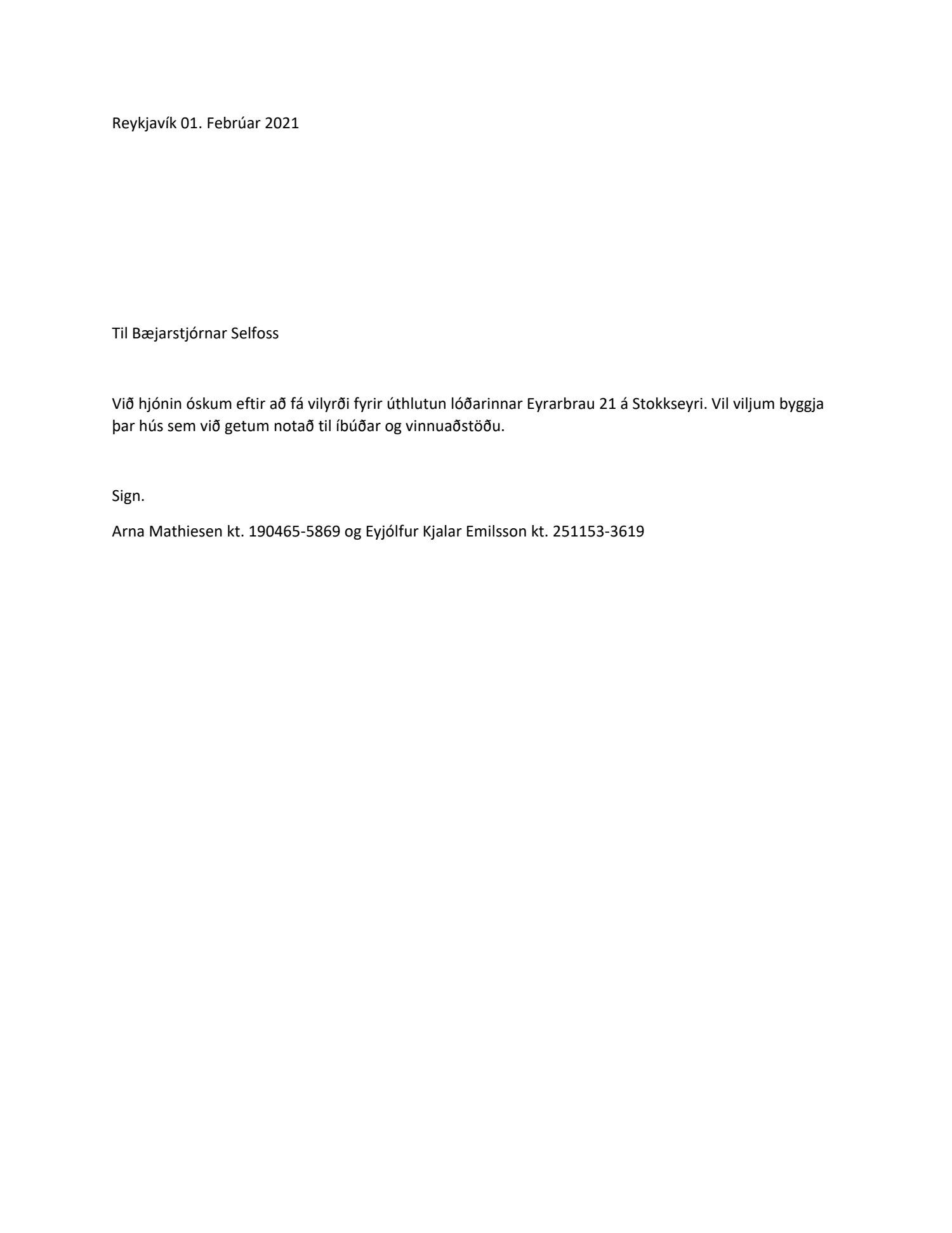 Beiðni Örnu Mathiesen, kt. 190465-5869 og Eyjólfs Kjalar Emilssonar, 251153-3619 um vilyrði fyrir lóðinni Eyrarbraut 21 á Stokkseyri, dags. 1. febrúar 2021.