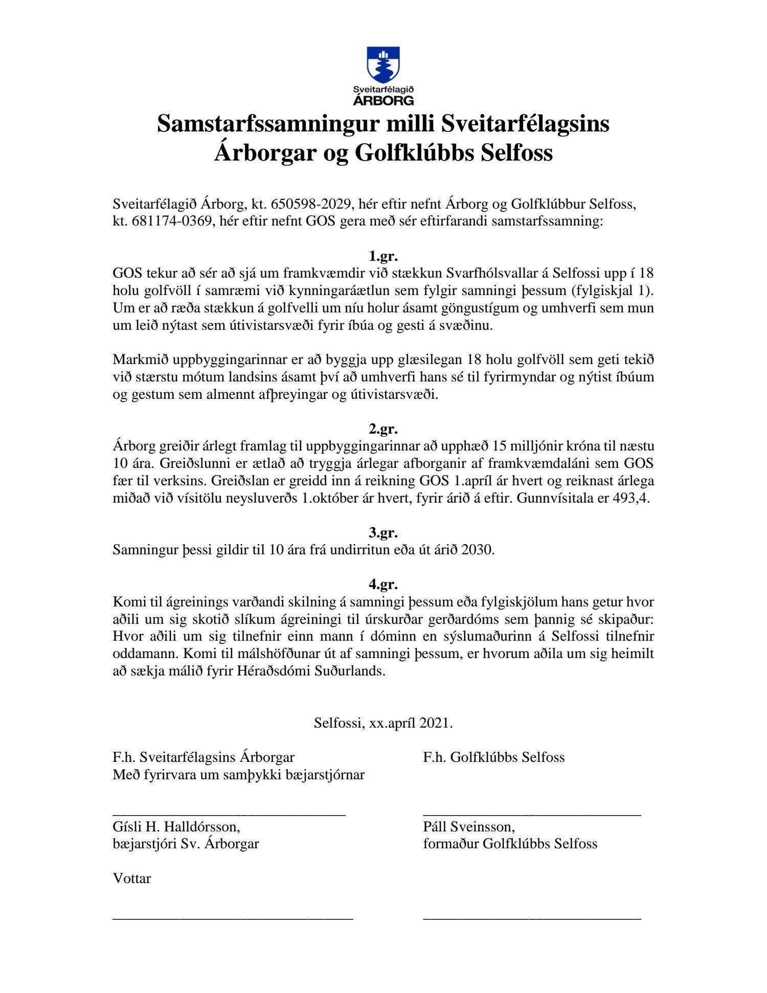Bæjarráð leggur til við bæjarstjórn að framlagður samningur verði samþykktur og viðauki vegna hans.Bæjarstjóra er falið að undirrita samninginn.