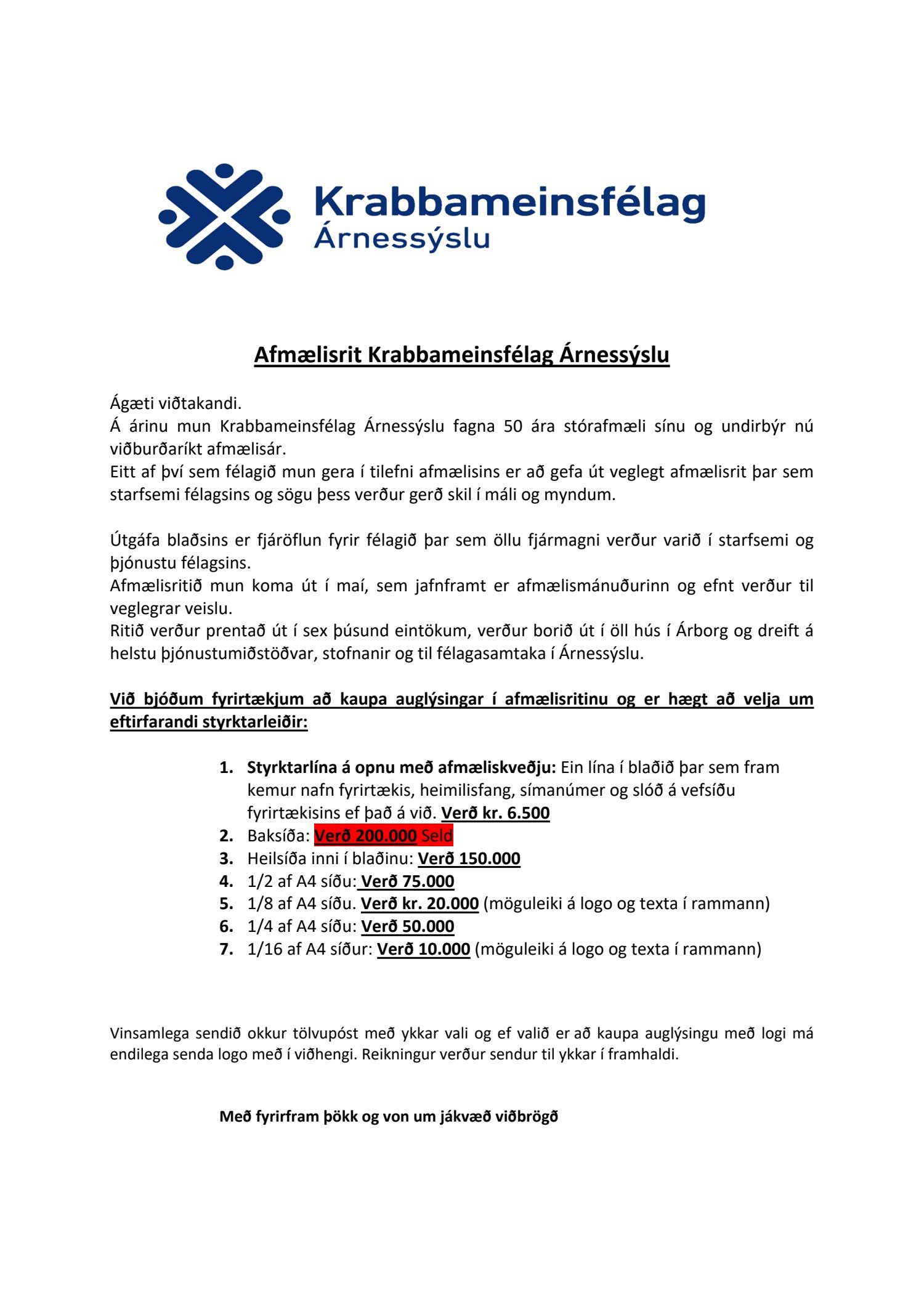 Bæjarráð samþykkir styrkveitingu til Krabbameinsfélags Árnessýslu með kaupum á auglýsingu í afmælisrit félagsins allt að kr. 50.000,-