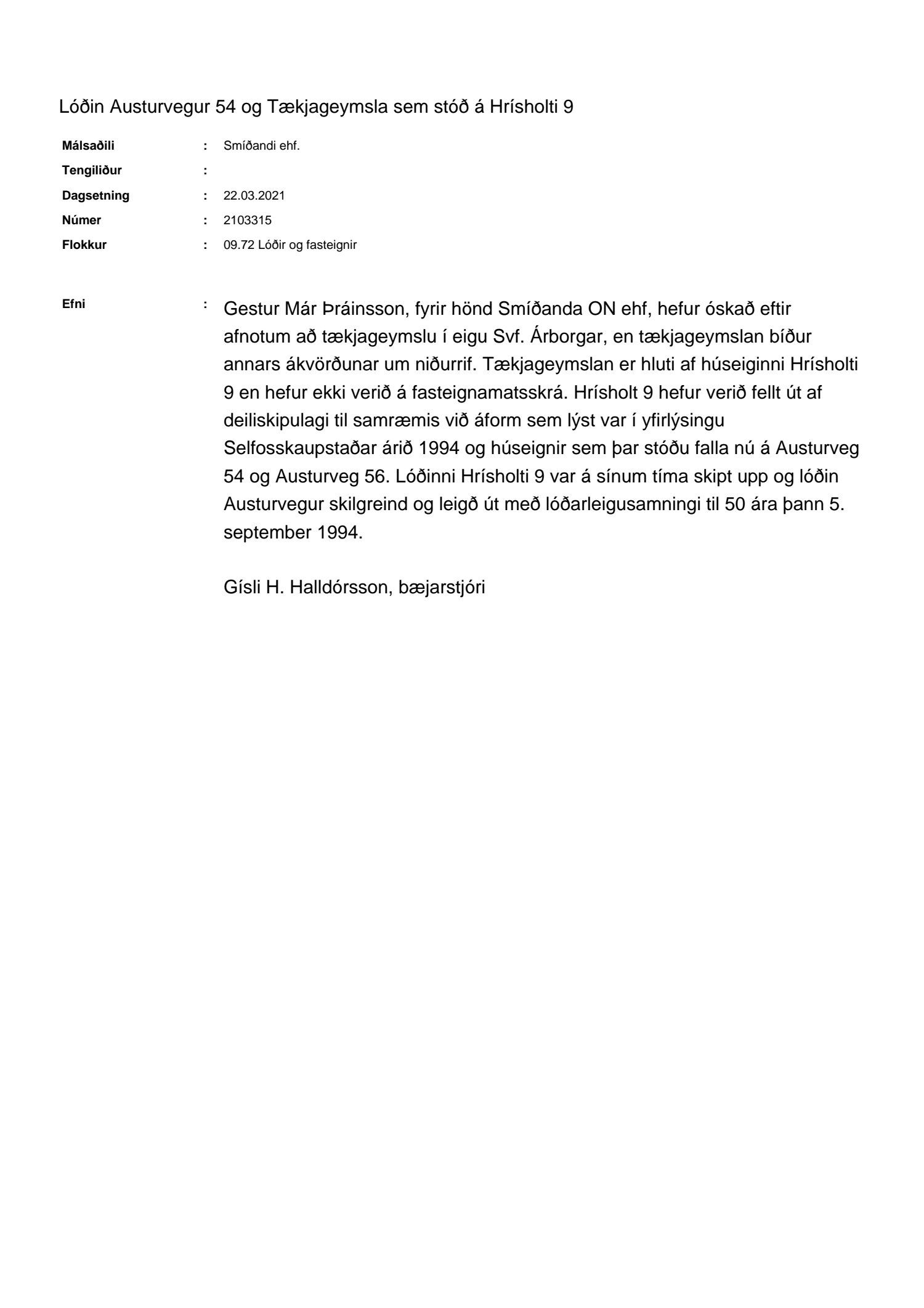 Bæjarráð samþykkir að skúr sem tilheyrði Hrísholti 9 en stendur á lóð Austurvegar 54 verði rifinn til samræmis við gildandi skipulag. Framkvæmdinni er vísað til Mannvirkja- og umhverfissviðs til úrvinnslu.