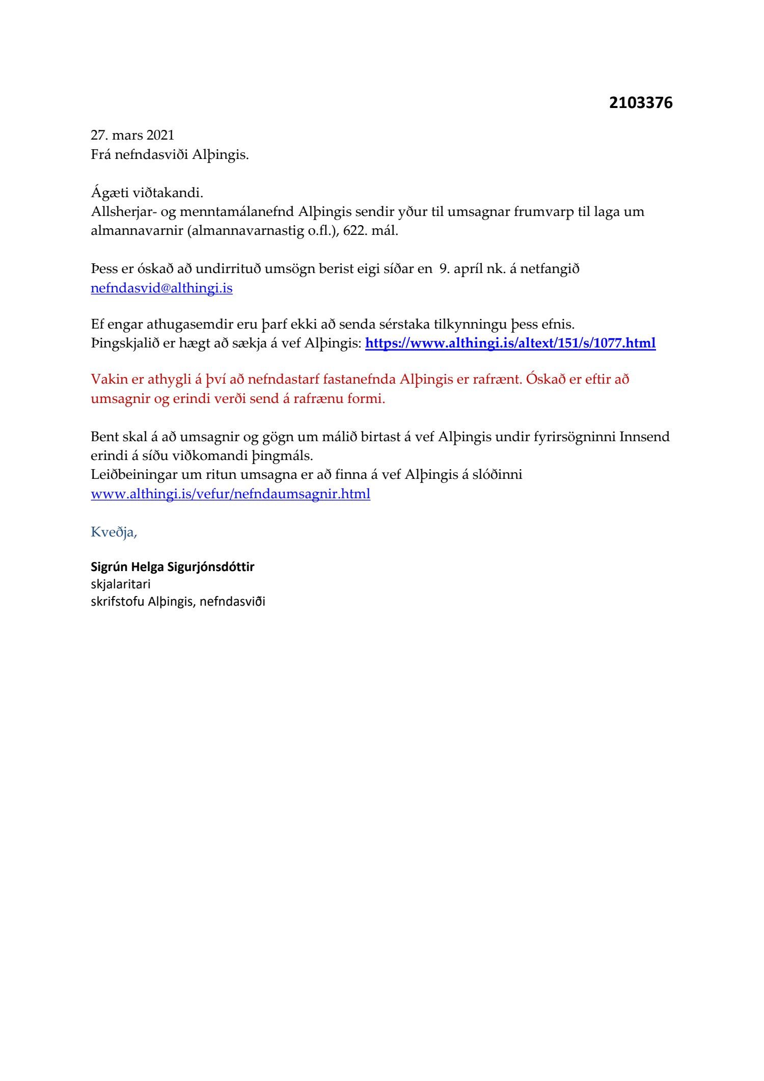 Erindi frá allsherjar- og menntamálanefnd Alþingis, dags. 27. mars, þar sem óskað var eftir umsögn um frumvarp til laga um almannavarnir (almannavarnastig o.fl.), 622. mál.