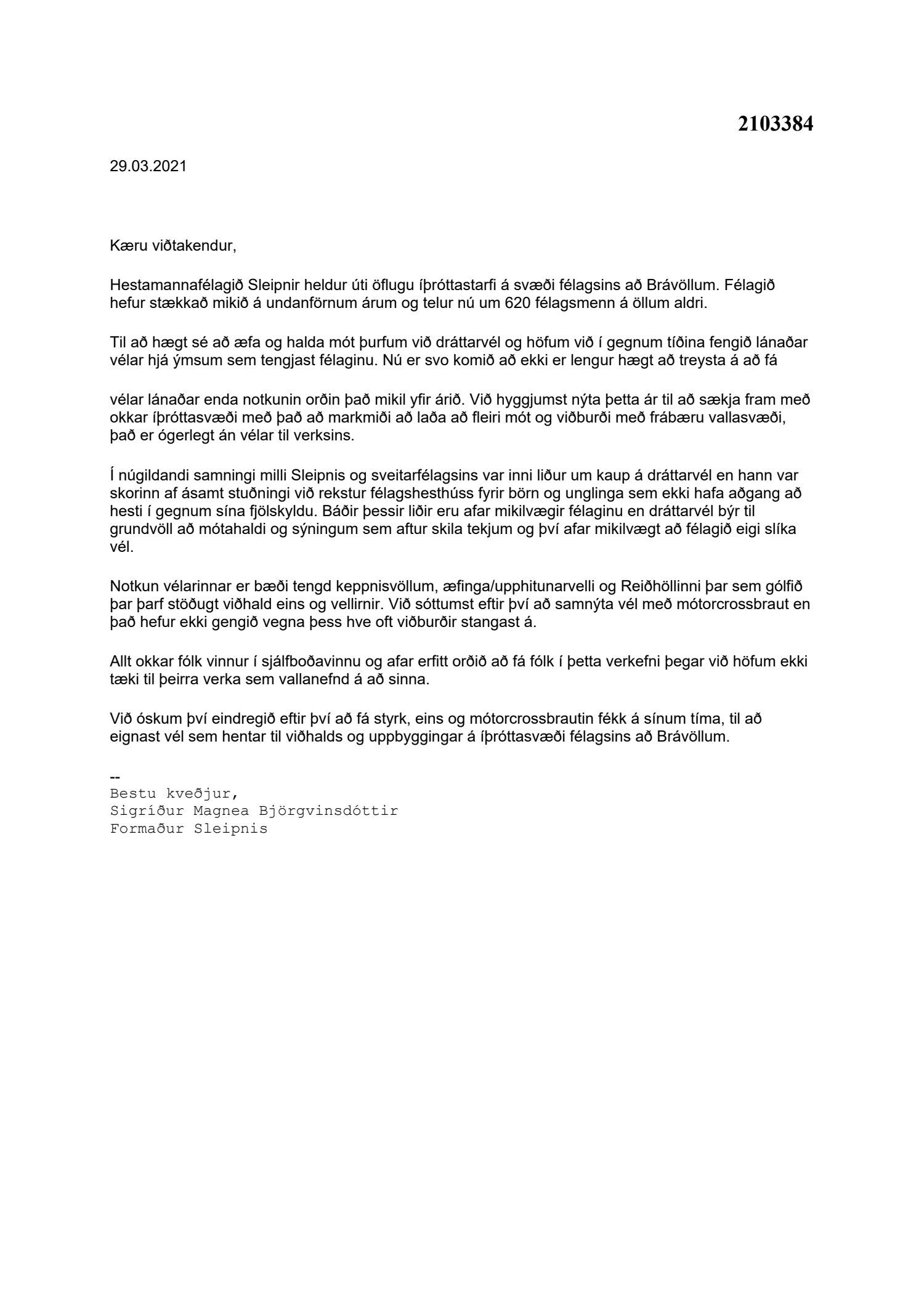 Erindi frá Hestamannafélaginu Sleipni, dags. 29. mars 2021, þar sem óskað er eftir styrk til kaupa á dráttarvél, sem nýtist til viðhalds og uppbyggingar á íþróttasvæði félagsins að Brávöllum.