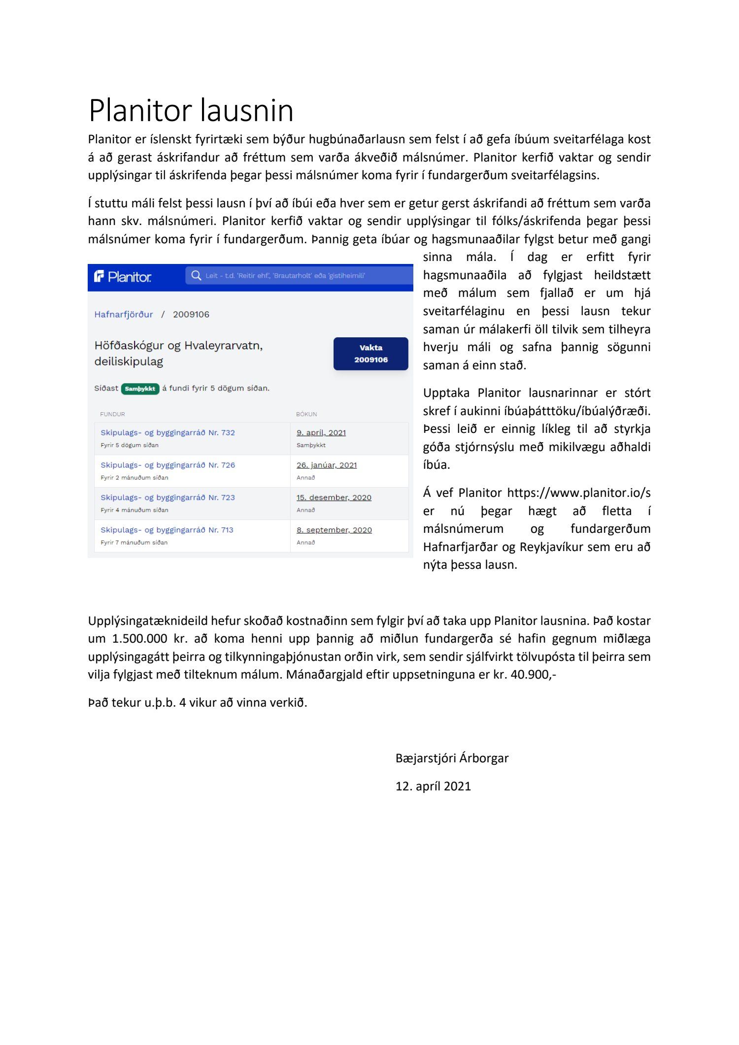 Skipulags- og byggingarnefnd lagði til við bæjarráð að gengið yrði til samninga við Planitor um vöktunarkerfi mála. Nefndin telur það til mikilla hagsbóta fyrir íbúa, umsóknaraðila og framkvæmdaaðila, að geta skráð sig sem áskrifendur á mál og þannig fylgst náið með afgreiðslu þeirra í gegnum ferli stjórnsýslunnar.