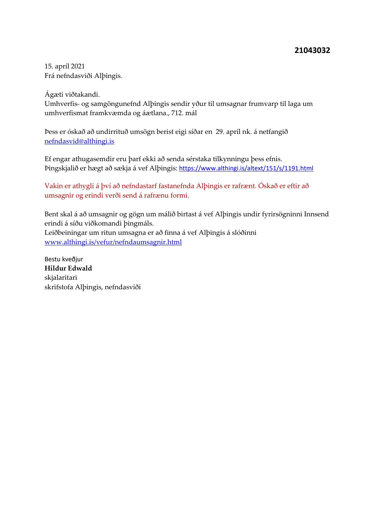Erindi frá umhverfis- og samgöngunefnd Alþingis, dags. 15. apríl, þar sem óskað var eftir umsögn um frumvarp til laga um umhverfismat framkvæmda og áætlana, 712. mál.
