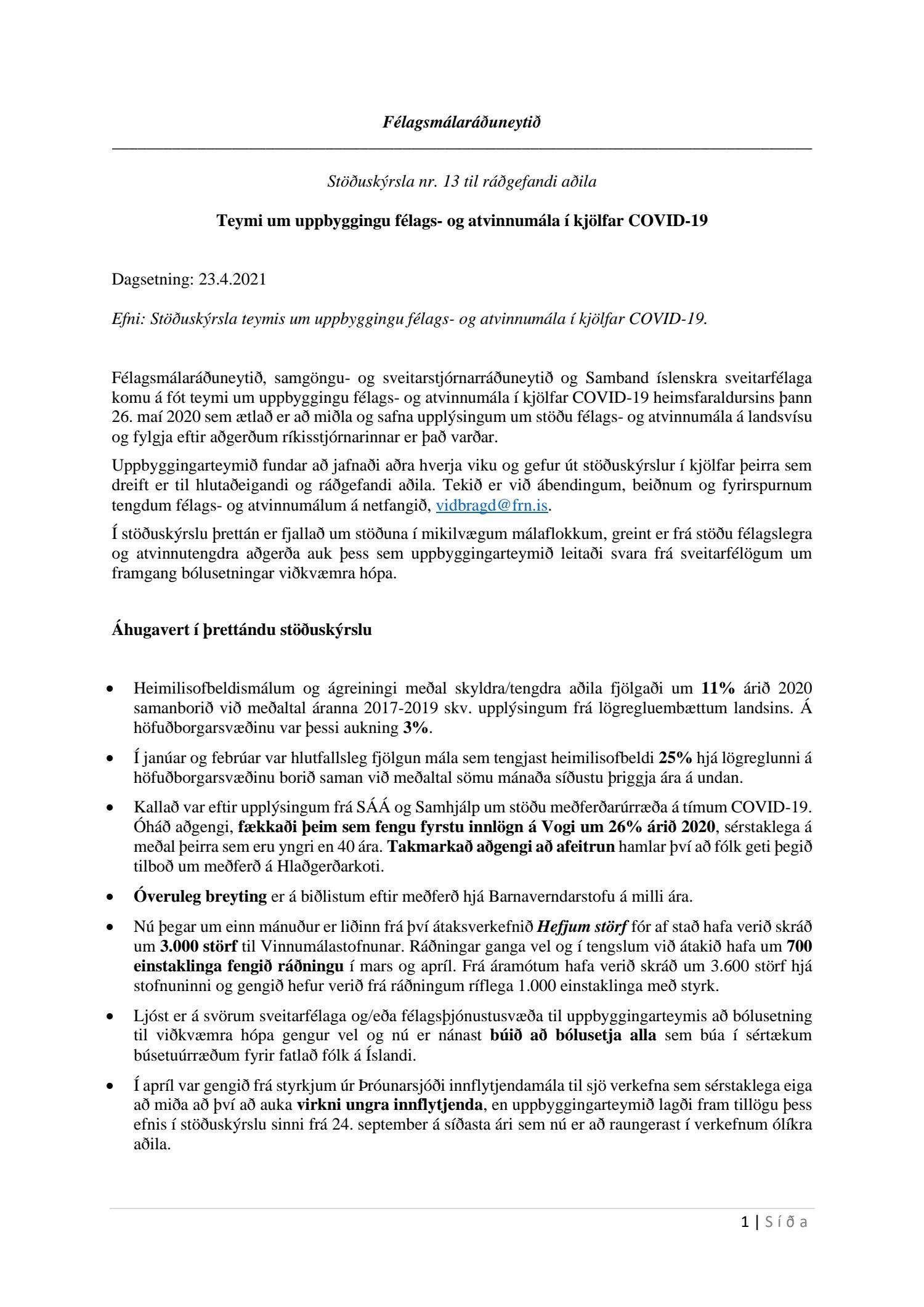 13. stöðuskýrsla uppbyggingarteymis félags- og atvinnumála, dags. 23. apríl 2021, í kjölfar Covid-19.