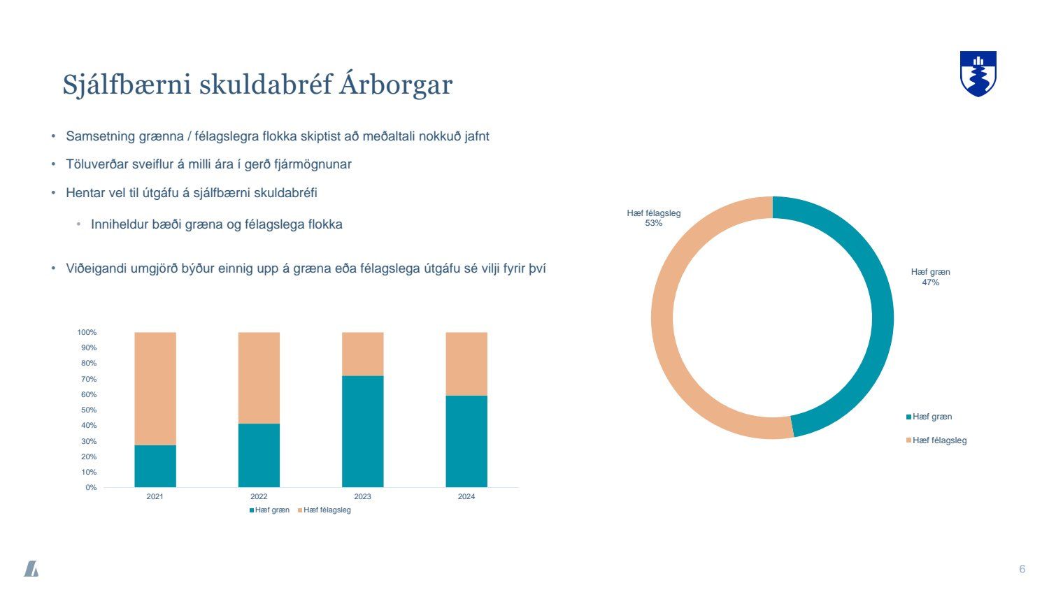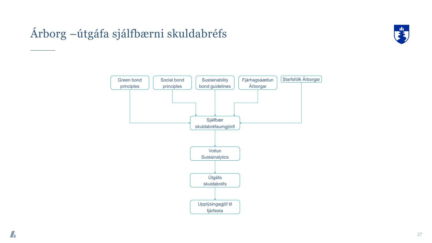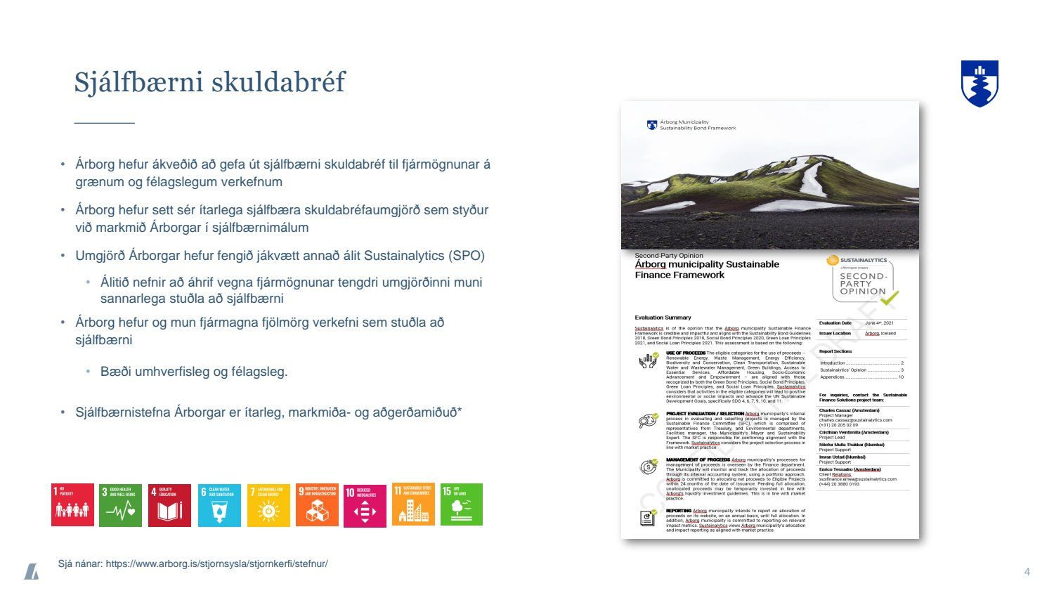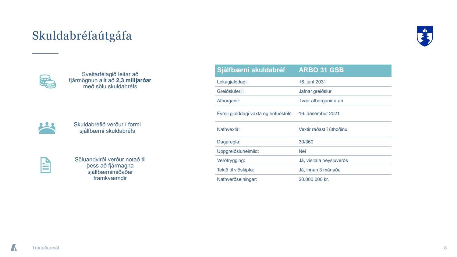 Bæjarráð samþykkir tilboð að nafnvirði 1.400 m.kr., á ávöxtunarkröfunni 1,35% í nýjan sjálfbæran verðtryggðan skuldabréfaflokk ARBO 31 GSB. Jafnframt samþykkir bæjarráð að heildarútgáfuheimild skuldabréfaflokksins verði opin og getur bæjarstjórn Árborgar þá veitt heimild til frekari stækkunar á skuldabréfaflokknum í framtíðinni.