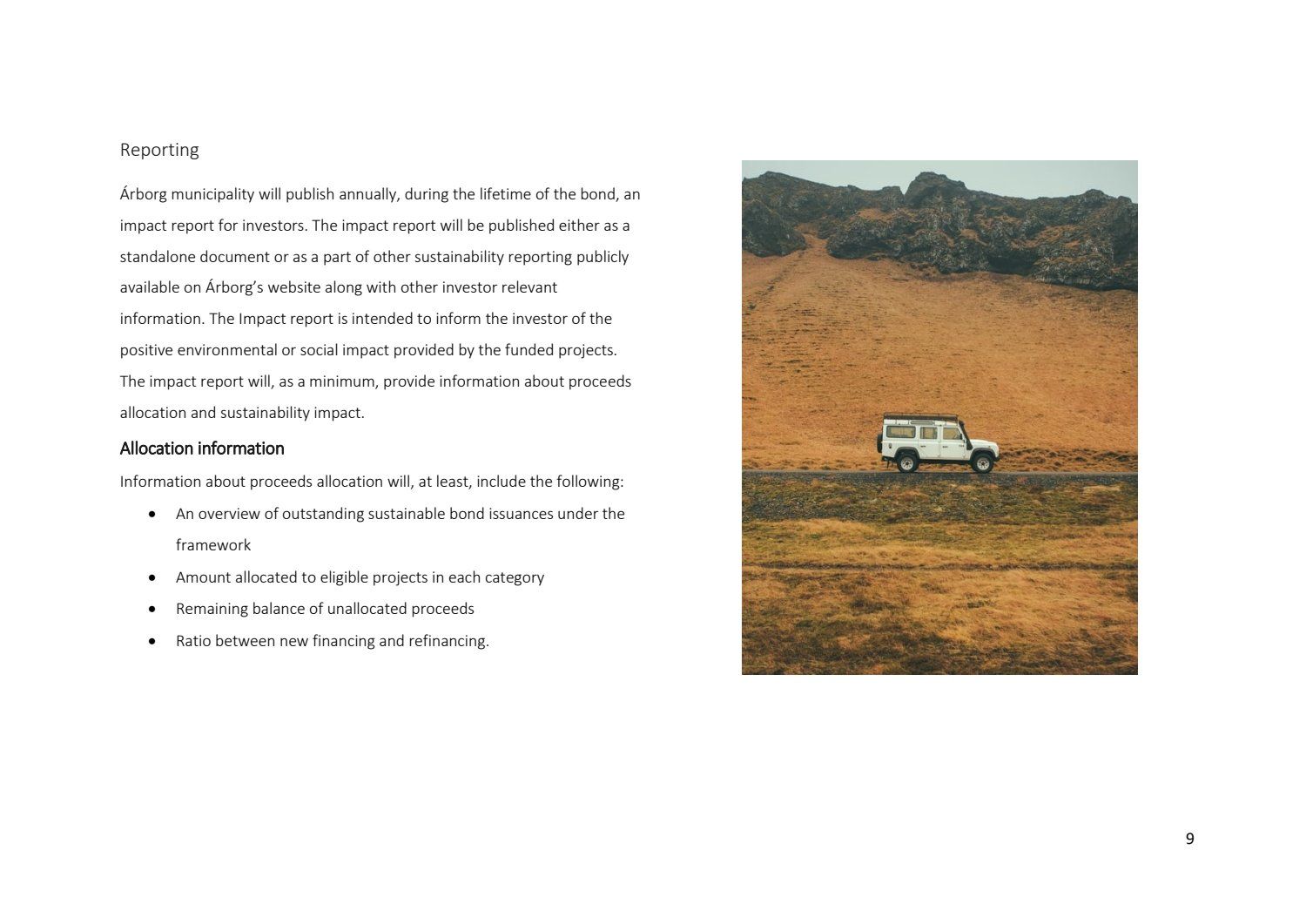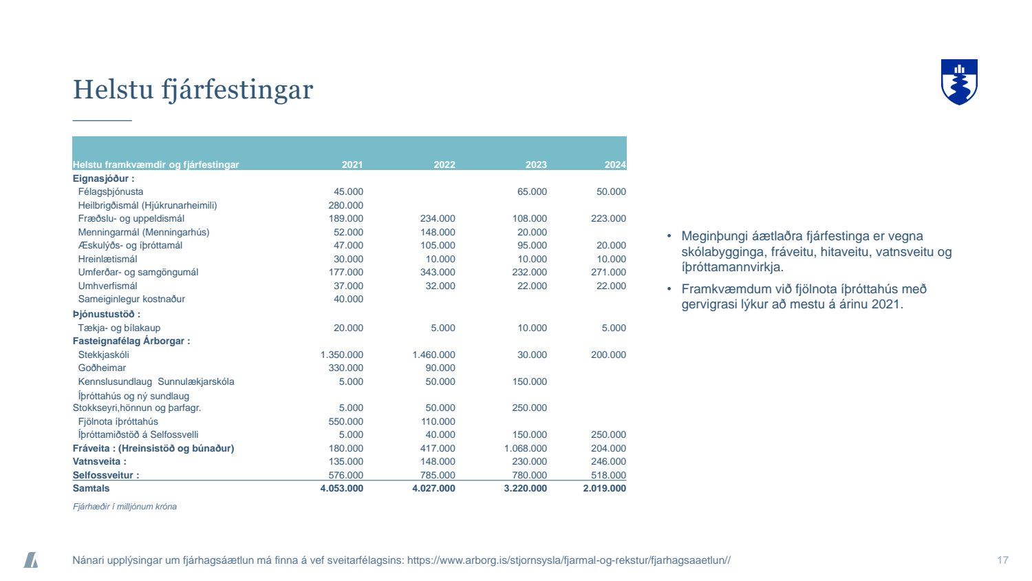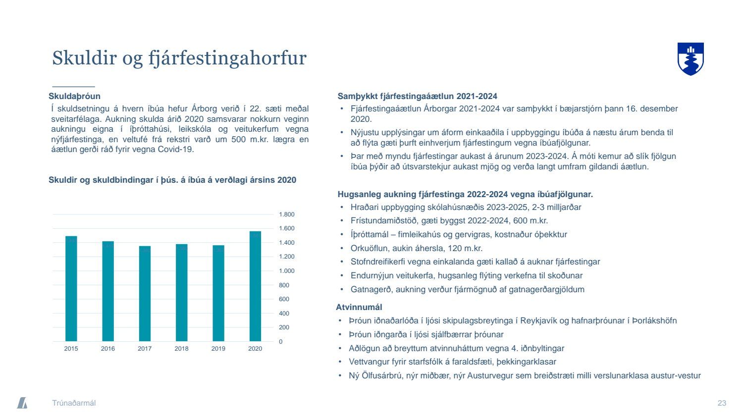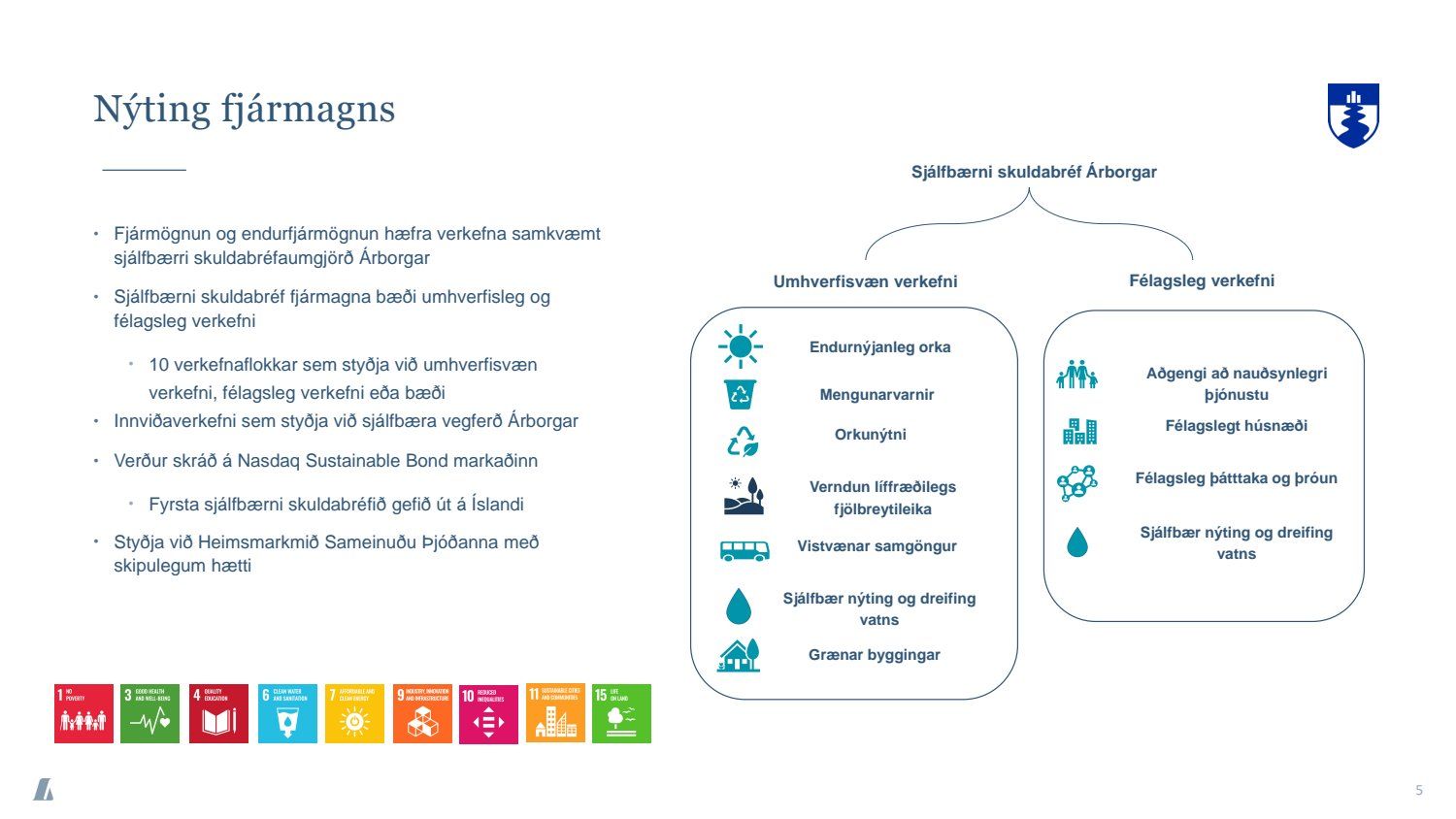 Bæjarráð samþykkir tilboð að nafnvirði 1.400 m.kr., á ávöxtunarkröfunni 1,35% í nýjan sjálfbæran verðtryggðan skuldabréfaflokk ARBO 31 GSB. Jafnframt samþykkir bæjarráð að heildarútgáfuheimild skuldabréfaflokksins verði opin og getur bæjarstjórn Árborgar þá veitt heimild til frekari stækkunar á skuldabréfaflokknum í framtíðinni.