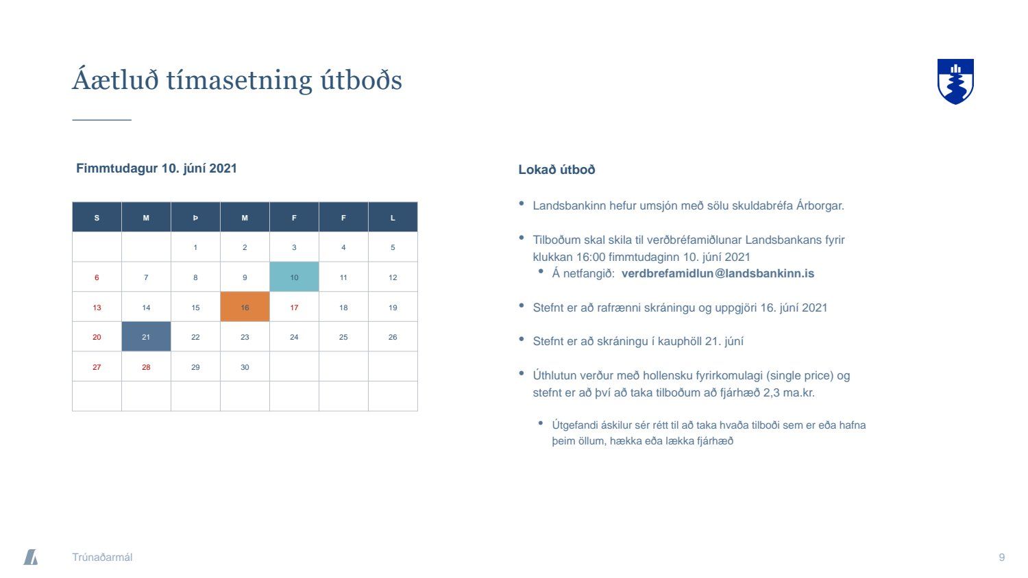 Kynning á niðurstöðu skuldabréfaútboðs. Opið var fyrir innsend tilboð til klukkan 16:00 þann 10. júní 2021.