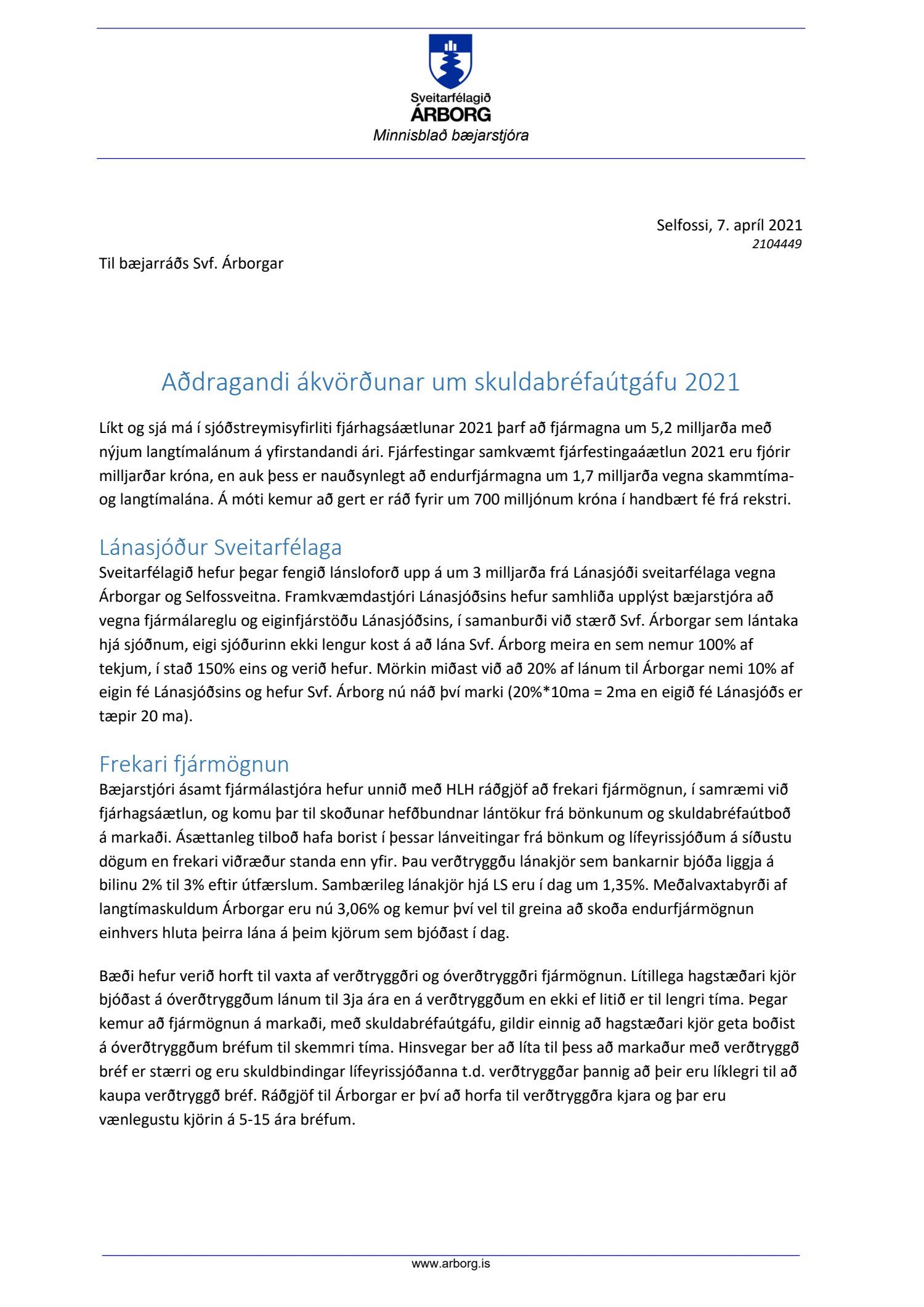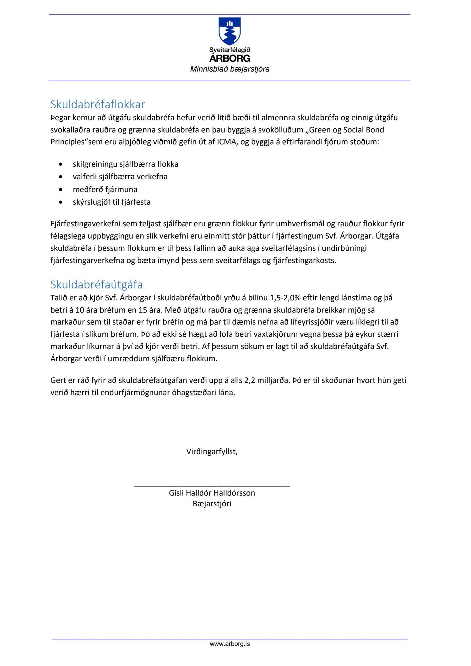 Útgáfa grænna og rauðra bréfa er mjög spennandi kostur og gæti mögulega bætt ímynd Árborgar sem sveitarfélags og fjárfestingarkosts, ásamt því að verða hvatning til agaðra vinnubragða í fjárfestingum og fjárfestingaáætlunum.