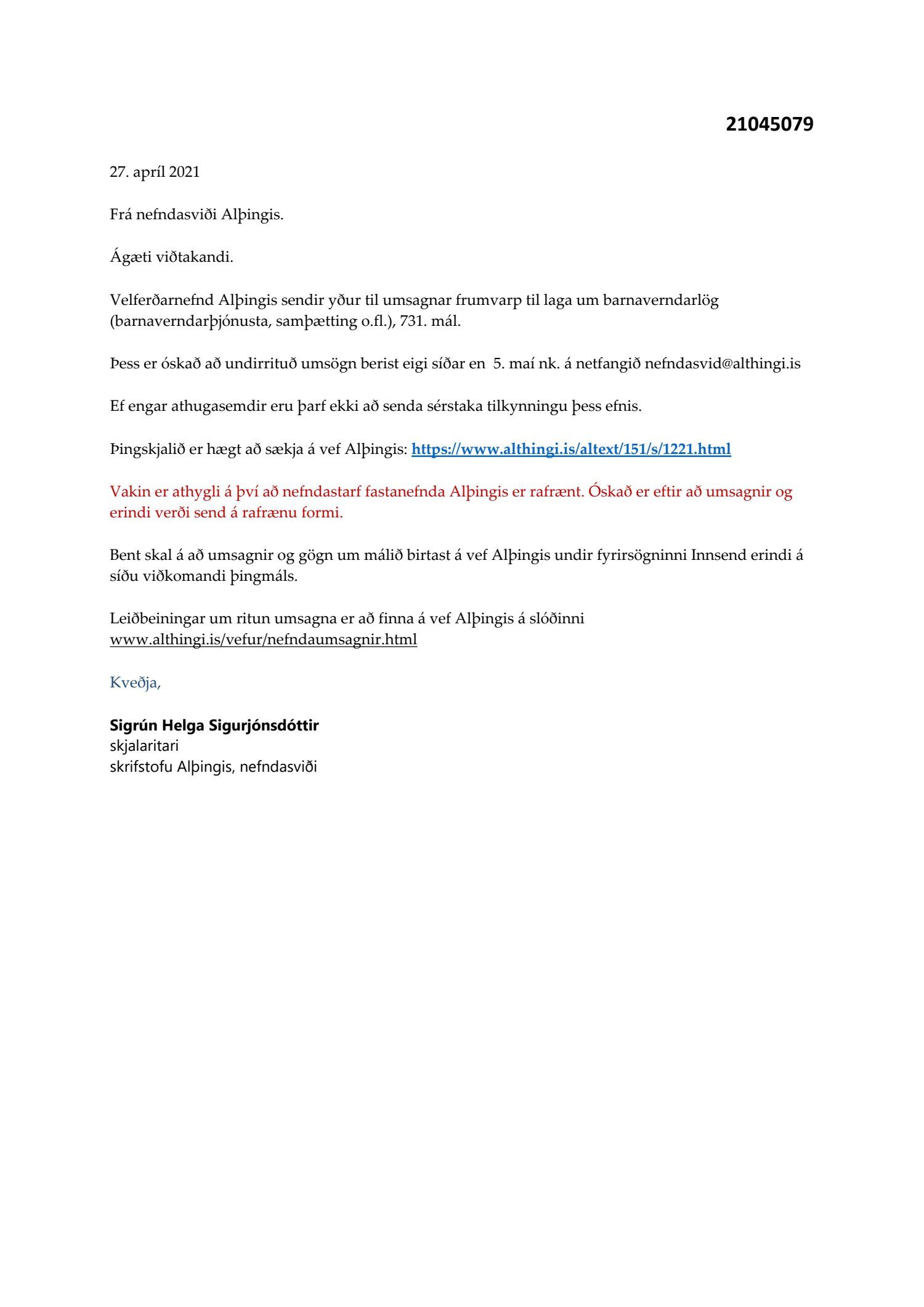 Erindi frá velferðarnefnd Alþingis, dags. 27. apríl, þar sem óskað var eftir umsögn um frumvarp til laga um barnaverndarlög (barnaverndarþjónusta, samþætting o.fl.), 731. mál.