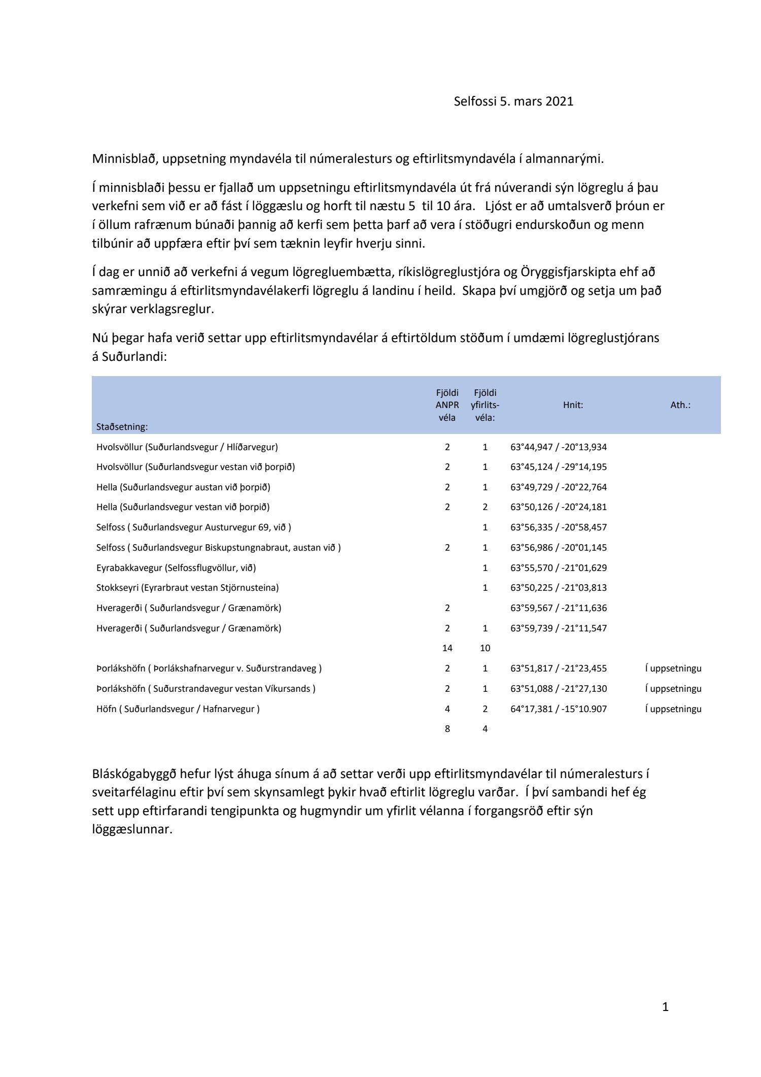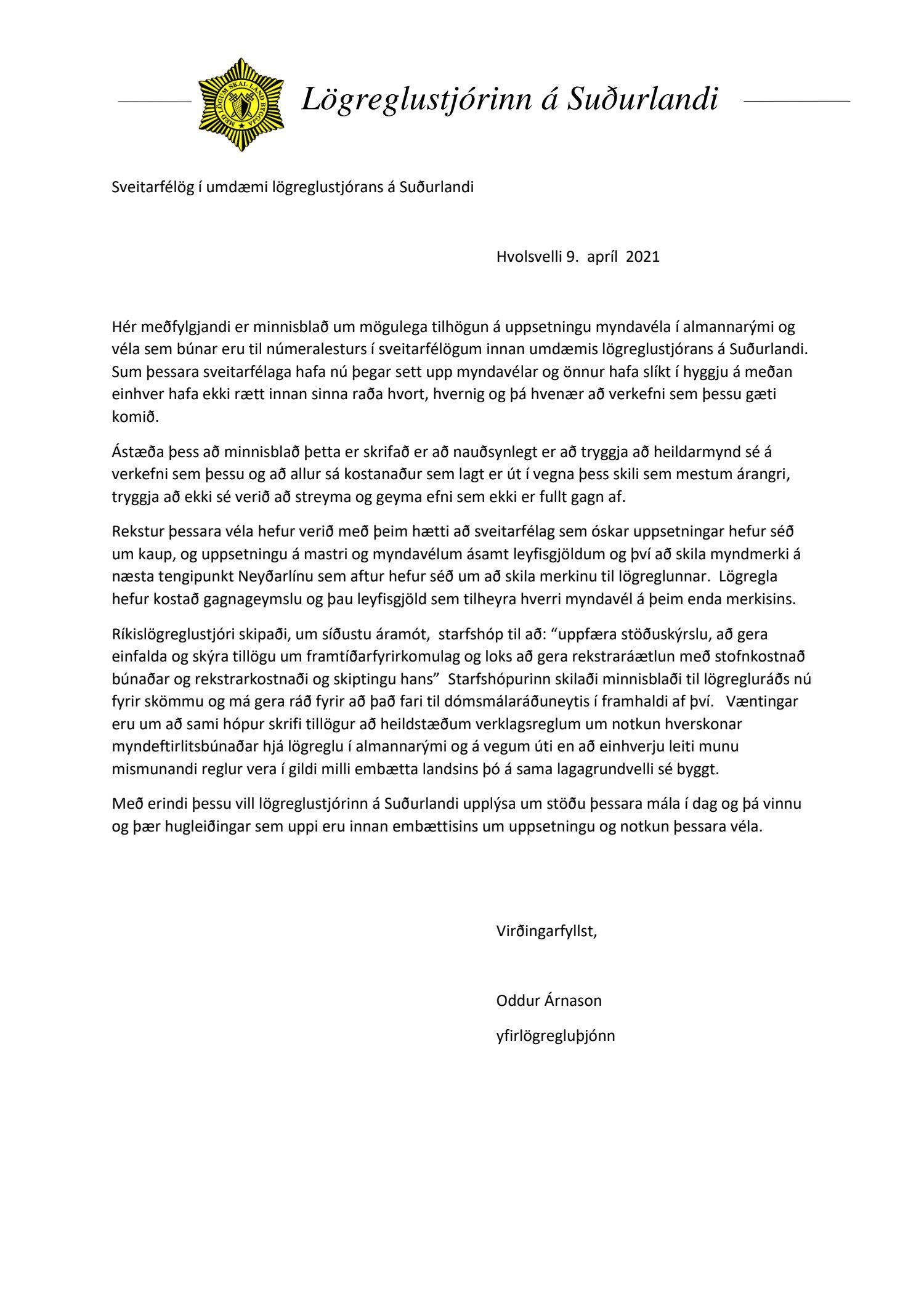Bréf frá lögreglustjóranum á Suðurlandi, dags. 9. apríl, með upplýsingum um eftirlitsmyndavélar innan umdæmis lögreglustjórans á Suðurlandi.