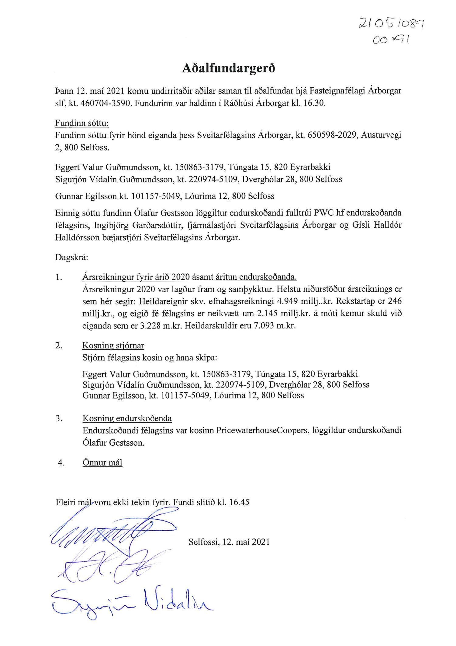 Fundargerðir Fasteignafélags Árborgar slf. 2021