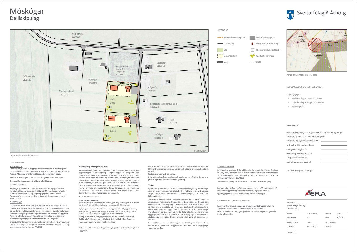 Tillagan var auglýst frá 30. júní 2021 með athugasemdafresti til og með 11. ágúst 2021. Engar athugasemdir bárust á auglýsingartíma tillögunnar, en umsagnir bárust frá lögboðnum umsagnaraðilum. Tillagan tók til bygginga á tveimur lóðum, hvor um sig 1ha, sem skipt er úr jörðinni Móskógum. Heimilt yrði að byggja íbúðarhús, bílskúr og skemmu á hvorri lóð.